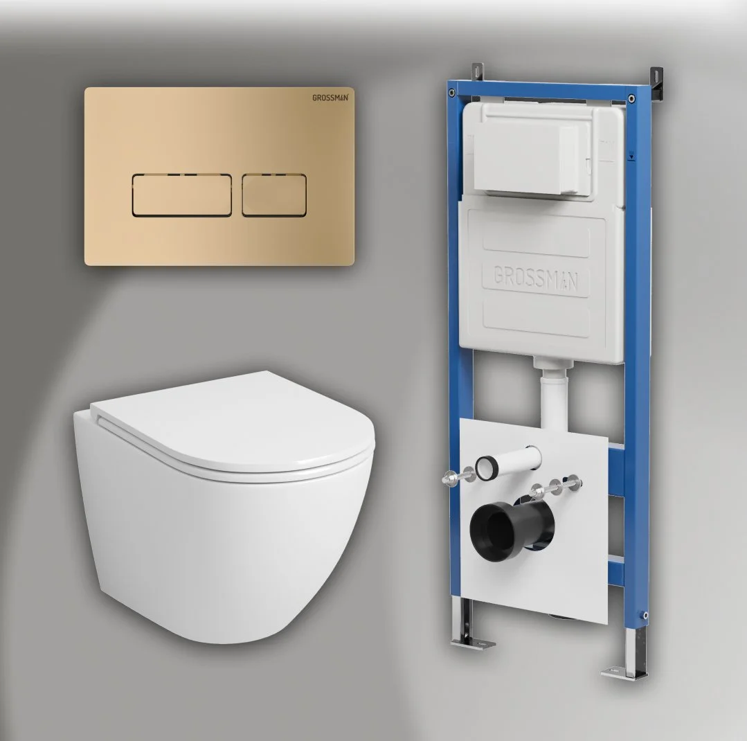 Комплект инсталляции GROSSMAN 900.K31.01.000 с клавишей смыва 700.K31.03.310.310 золото матовое и унитазом GROSSMAN GR-4455SQ арт.97.4455SQ.03.310
