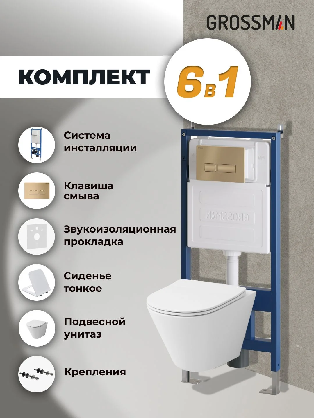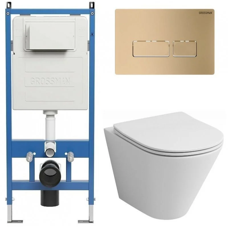 Комплект инсталляции GROSSMAN 900.K31.01.000 с клавишей смыва 700.K31.03.310.310 золото матовое и унитазом GROSSMAN GR-4477S арт.97.4477S.03.310