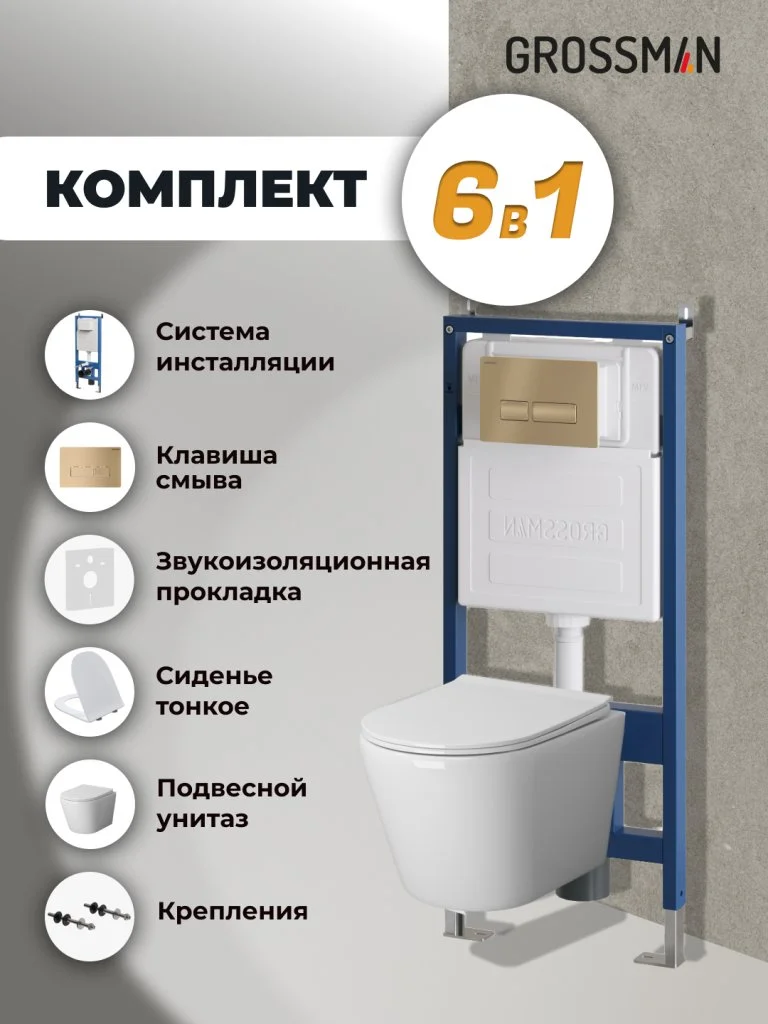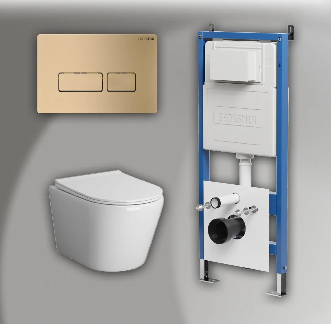 Комплект инсталляции GROSSMAN 900.K31.01.000 с клавишей смыва 700.K31.03.310.310 золото матовое и унитазом GROSSMAN GR-4478SQ арт.97.4478SQ.03.310