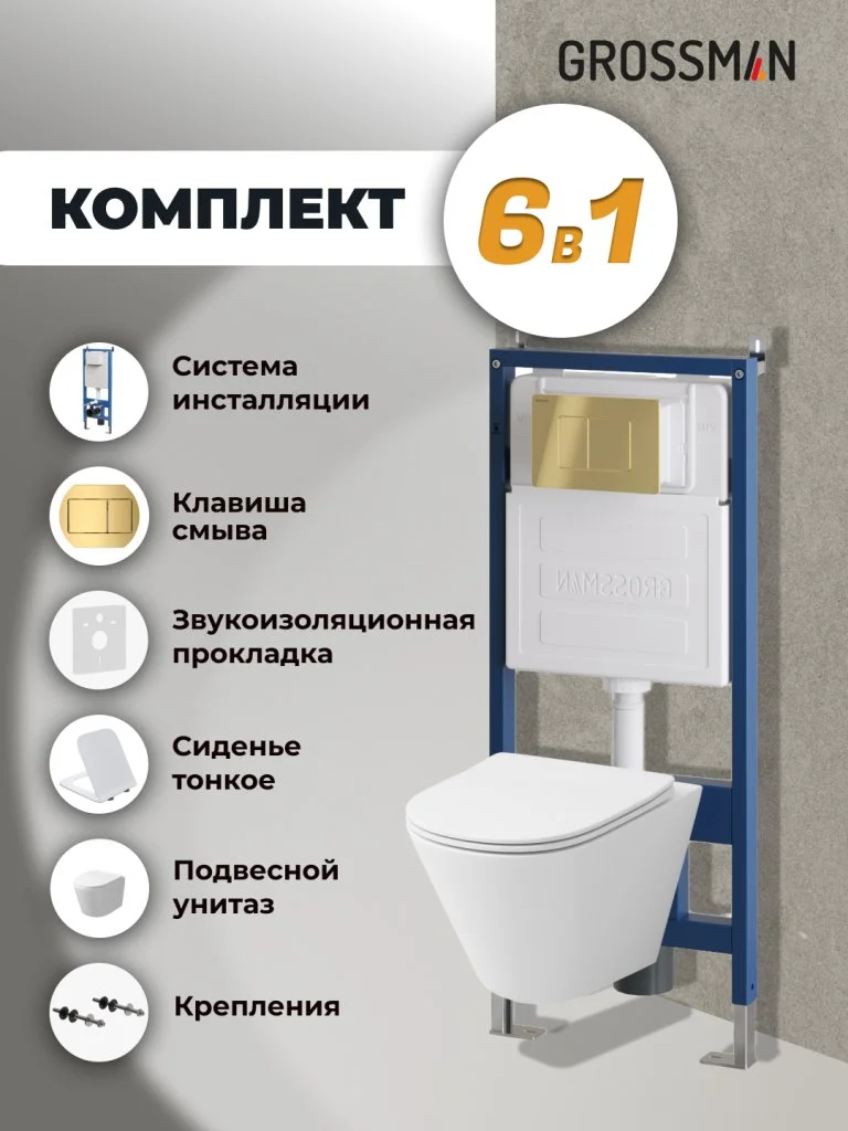 Комплект инсталляции GROSSMAN 900.K31.01.000 с клавишей смыва 700.K31.04.30M.30M золото и унитазом GROSSMAN GR-4477SQ арт.97.4477SQ.04.30M