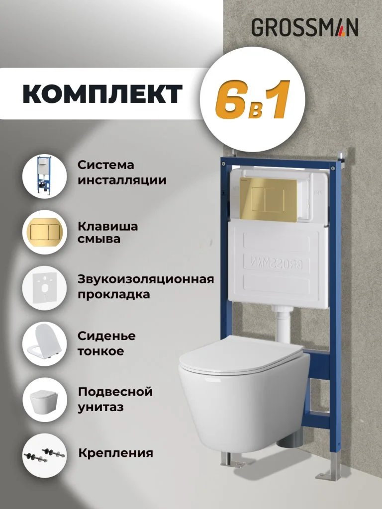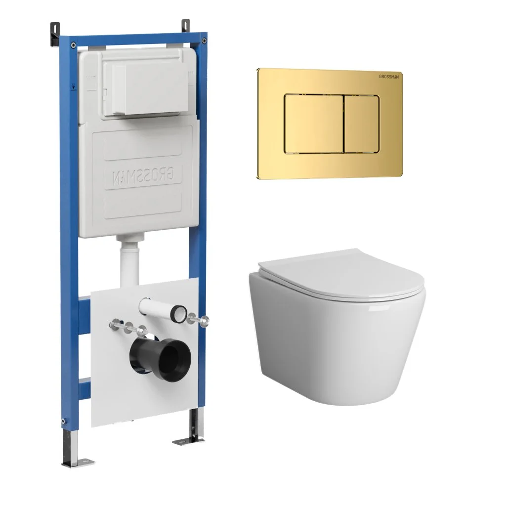 Комплект инсталляции GROSSMAN 900.K31.01.000 с клавишей смыва 700.K31.04.30M.30M золото и унитазом GROSSMAN GR-4478SQ арт.97.4478SQ.04.30M