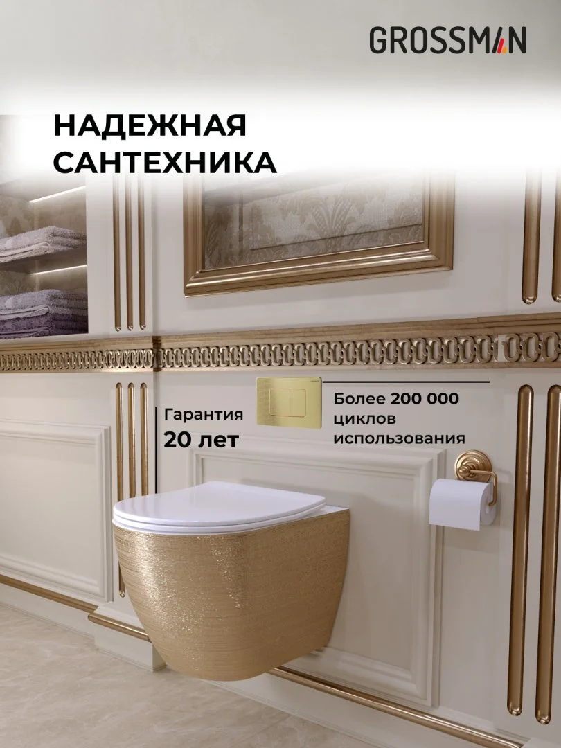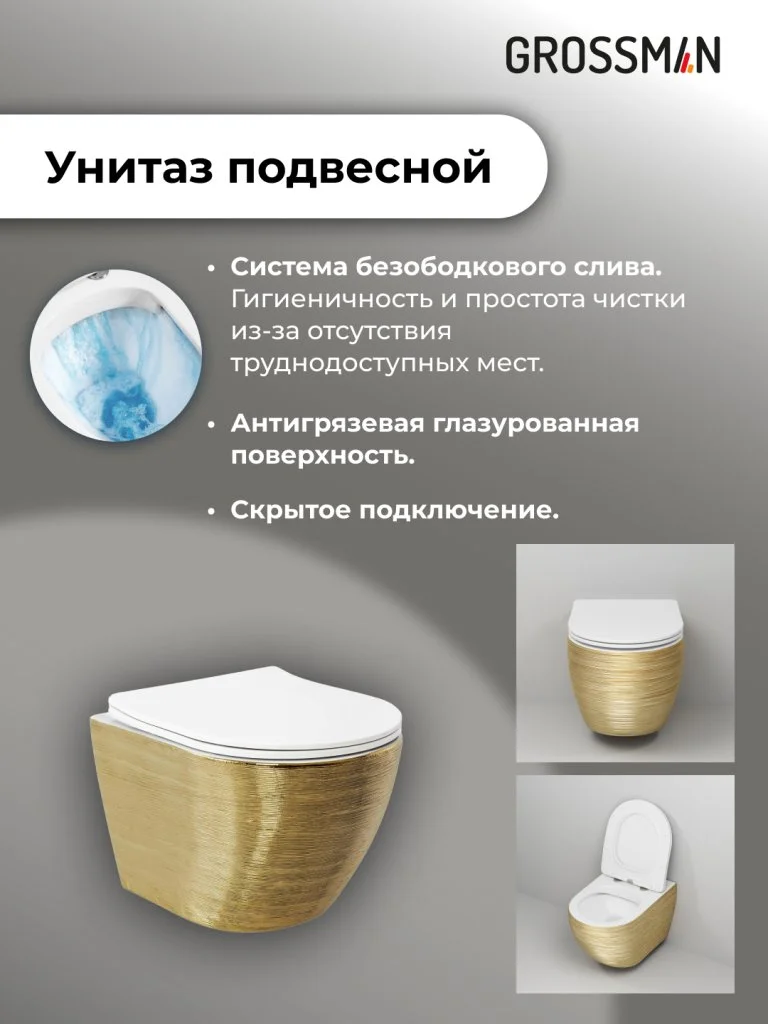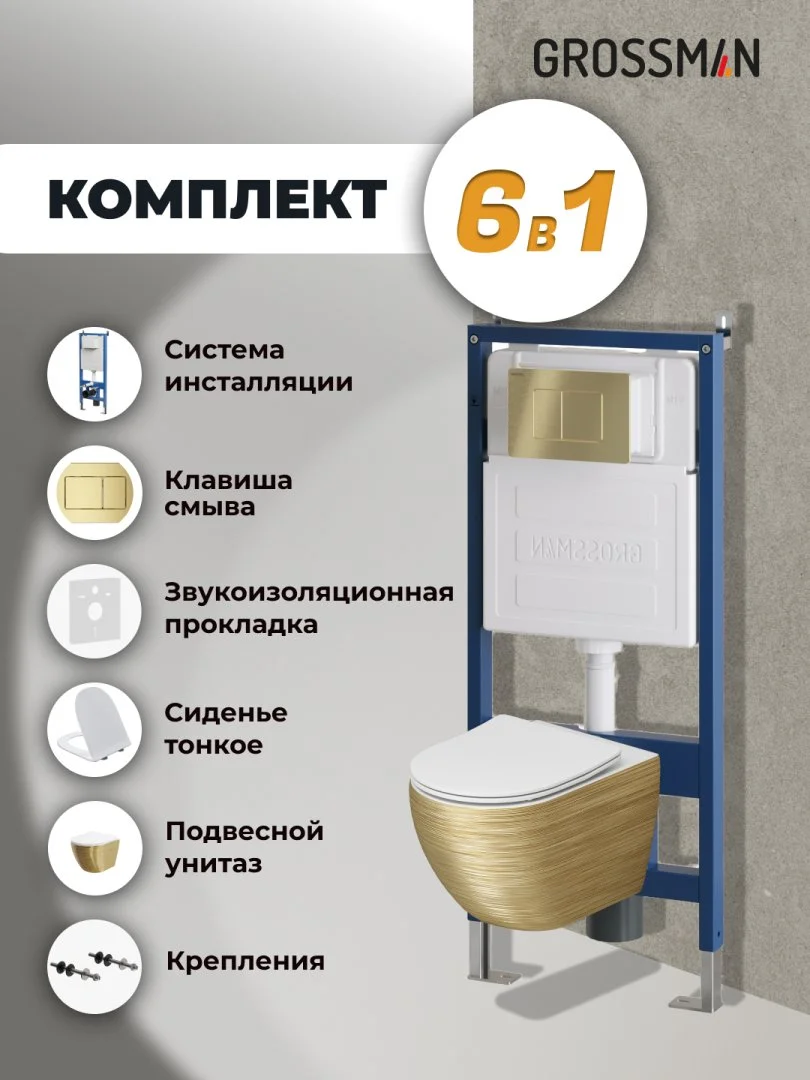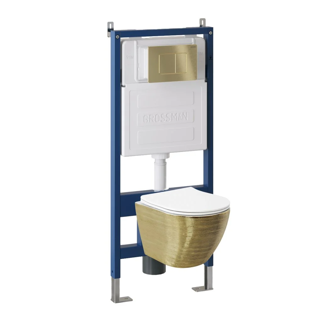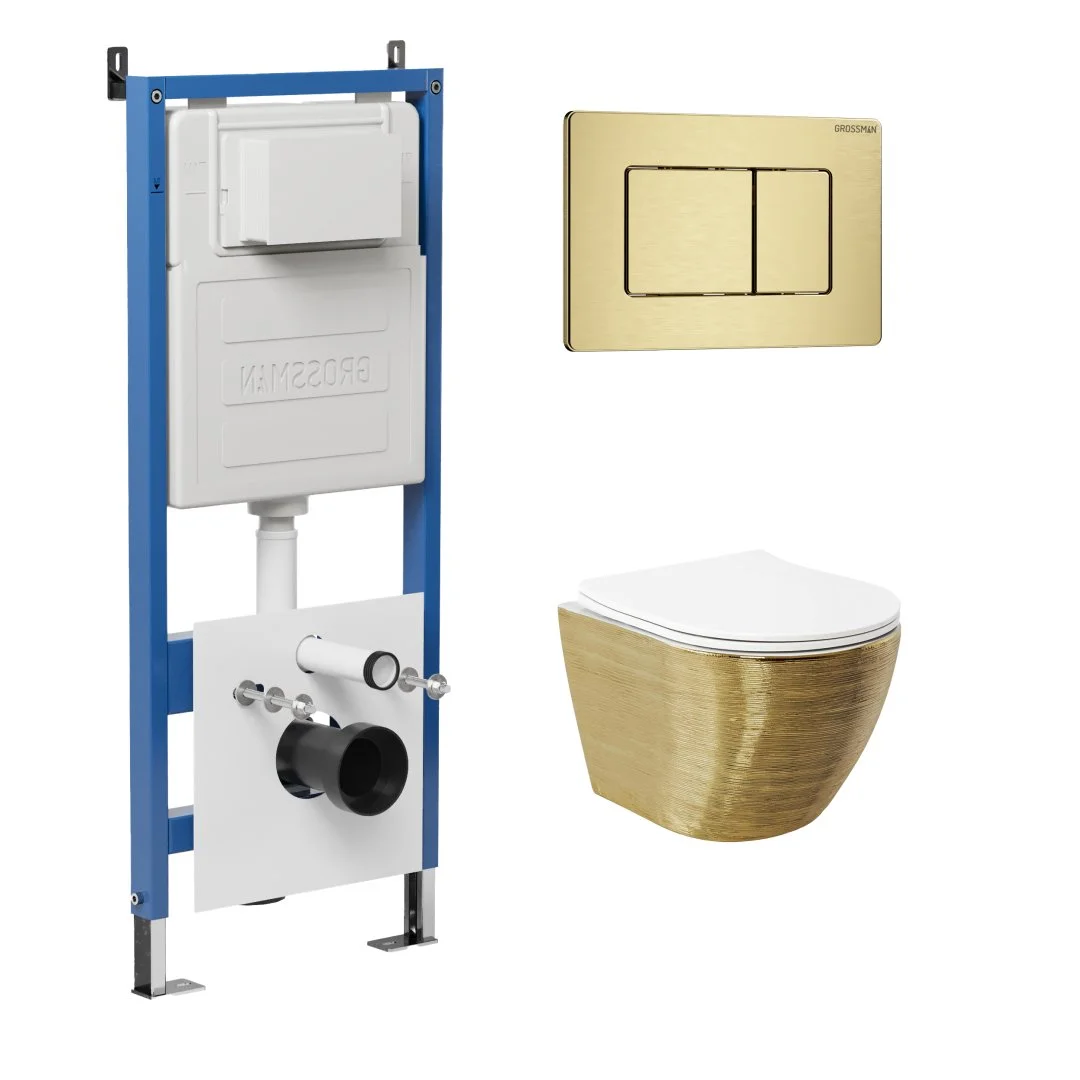Комплект инсталляции GROSSMAN 900.K31.01.000 с клавишей смыва 700.K31.04.32M.32M золото сатиновое и унитазом GROSSMAN GR-4455GWS арт.97.4455GWS.04.32M