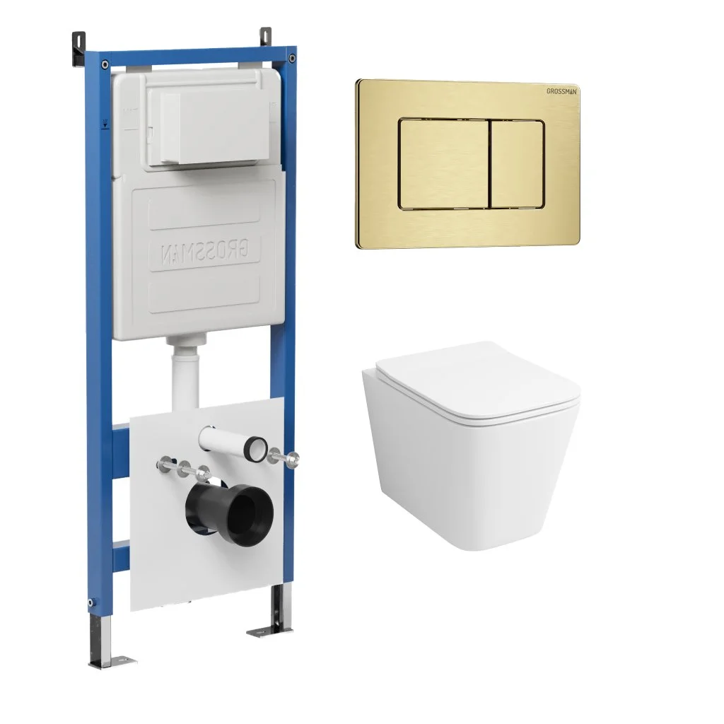 Комплект инсталляции GROSSMAN 900.K31.01.000 с клавишей смыва 700.K31.04.32M.32M золото сатиновое и унитазом GROSSMAN GR-4441S арт.97.4441S.04.32M