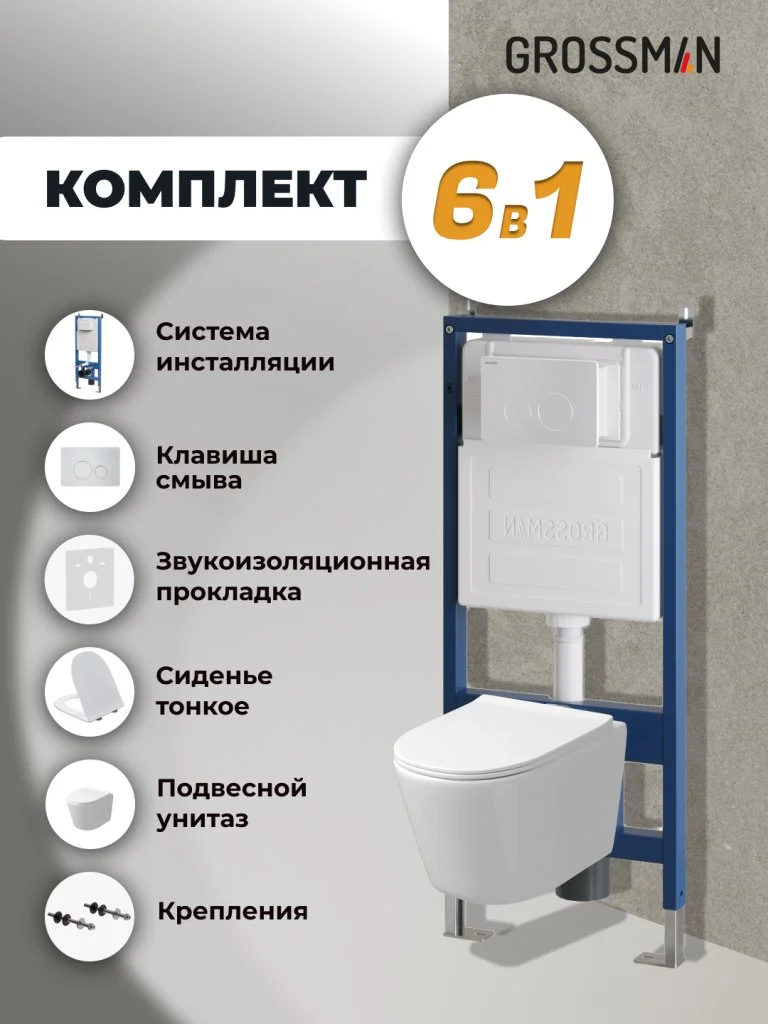 Комплект инсталляции GROSSMAN 900.K31.01.000 с клавишей смыва 700.K31.05.01M.01M белый матовый и унитазом GROSSMAN GR-4477SQ арт.97.4477SQ.05.01M
