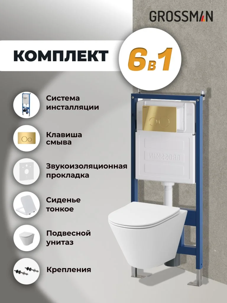 Комплект инсталляции GROSSMAN 900.K31.01.000 с клавишей смыва 700.K31.05.30M.30M золото и унитазом GROSSMAN GR-4477S арт.97.4477S.05.30M