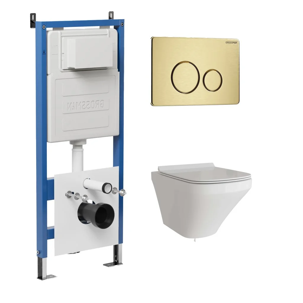 Комплект инсталляции GROSSMAN 900.K31.01.000 с клавишей смыва 700.K31.05.32M.32M золото сатиновое и унитазом GROSSMAN GR-4440S арт.97.4440S.05.32M