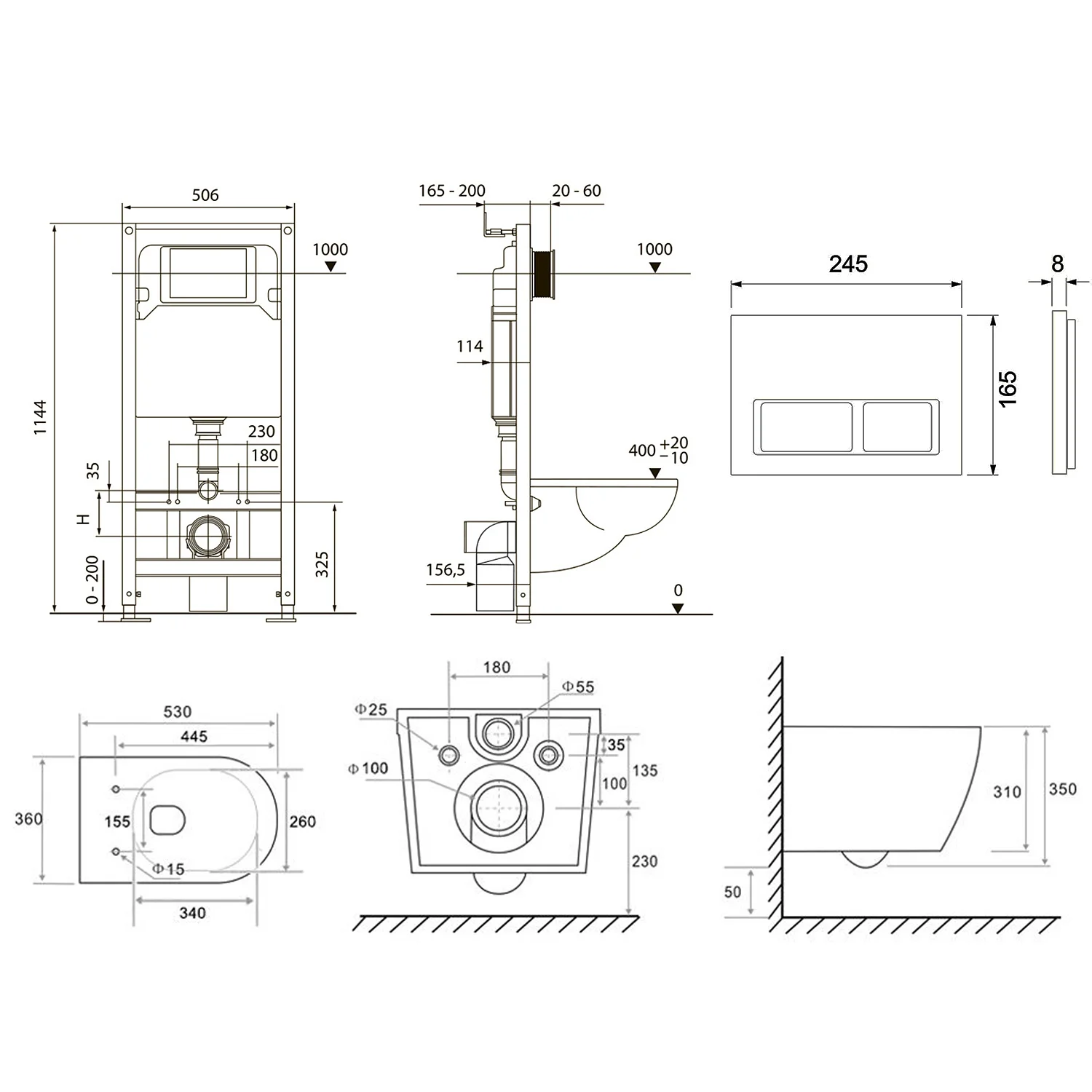 Комплект для установки подвесного унитаза: застенный модуль, Клавиша смыва TECEspring V, черная матовая, унитаз TECEspring R