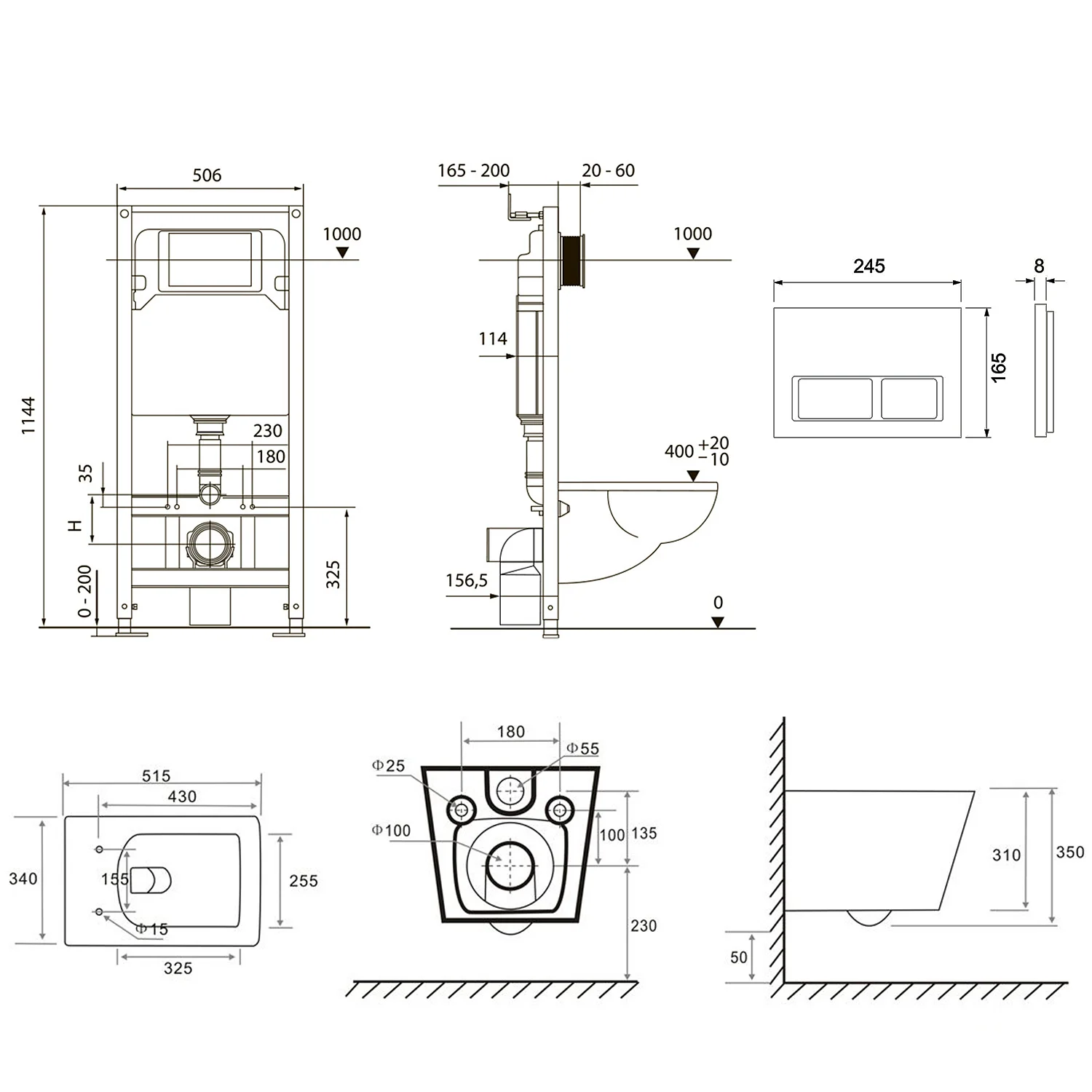 Комплект для установки подвесного унитаза: застенный модуль, Клавиша смыва TECEspring V, черная матовая, унитаз TECEspring S