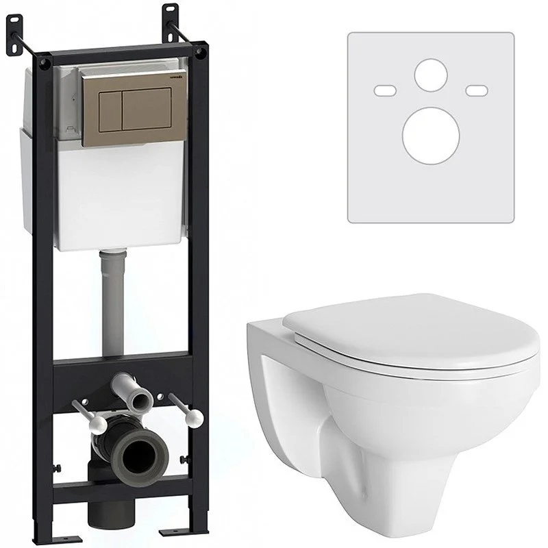 Полностью готовый к установке комплект: система инсталляции с клавишей подвесной унитаз с сиденьем. Неразборная рама из стального профиля выдерживает нагрузку до 400 кг. Полностью изолированный бачок с двухрежимной смывной арматурой.