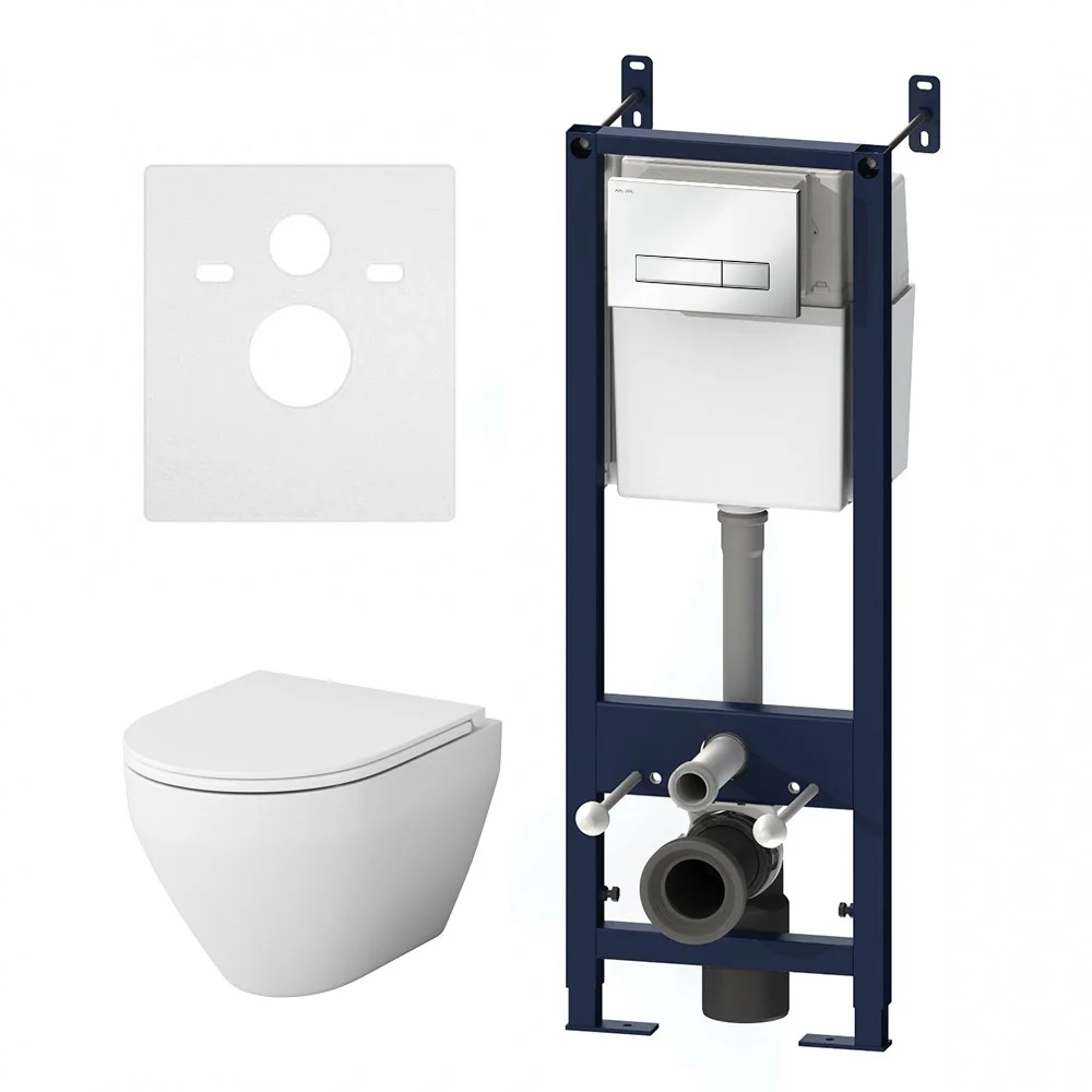 Полностью готовый к установке комплект: система инсталляции с клавишей подвесной унитаз с сиденьем. Неразборная рама из стального профиля выдерживает нагрузку до 400 кг. Полностью изолированный бачок с двухрежимной смывной арматурой. Укомплектован механической клавишей в цвете белый. В комплекте все необходимые патрубки и крепления а также прокладка между унитазом и стеной - звукоизоляция.