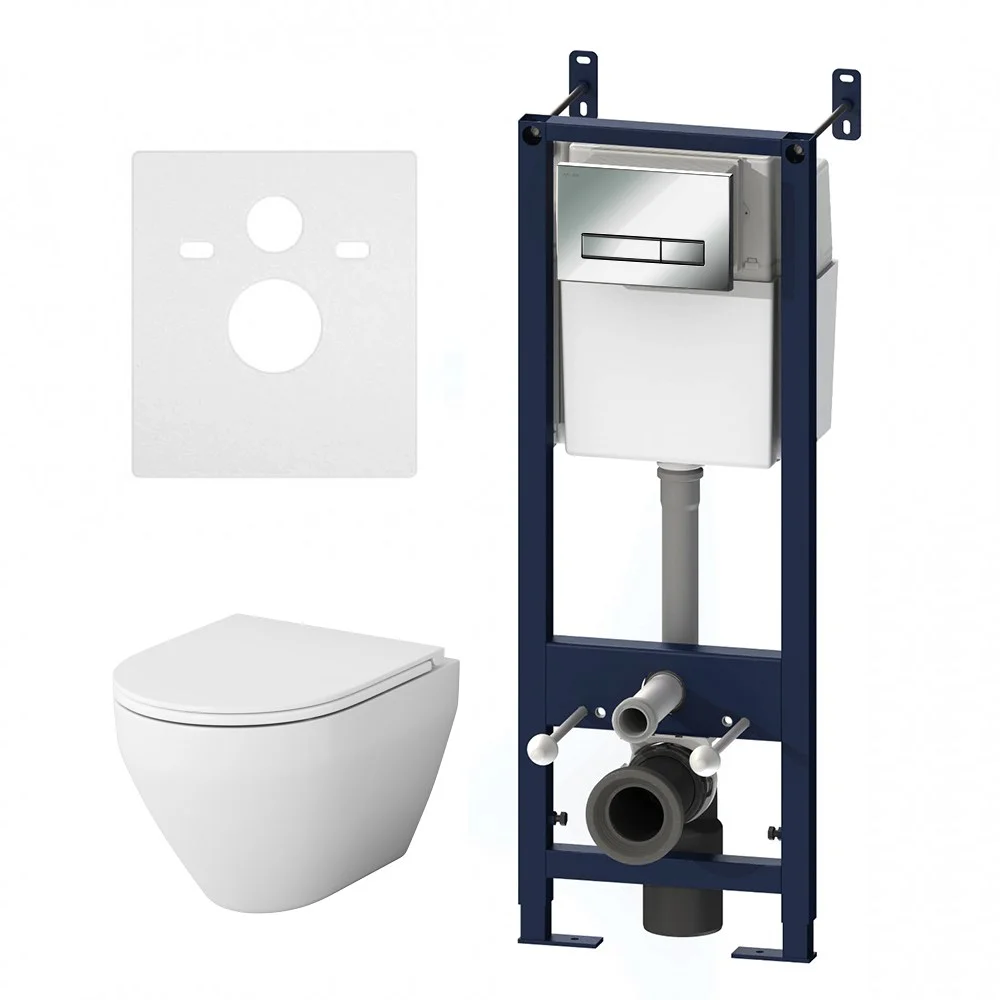 Полностью готовый к установке комплект: система инсталляции с клавишей подвесной унитаз с сиденьем. Неразборная рама из стального профиля выдерживает нагрузку до 400 кг. Полностью изолированный бачок с двухрежимной смывной арматурой. Укомплектован механической клавишей в цвете глянцевый хром. В комплекте все необходимые патрубки и крепления а также прокладка между унитазом и стеной - звукоизоляция.