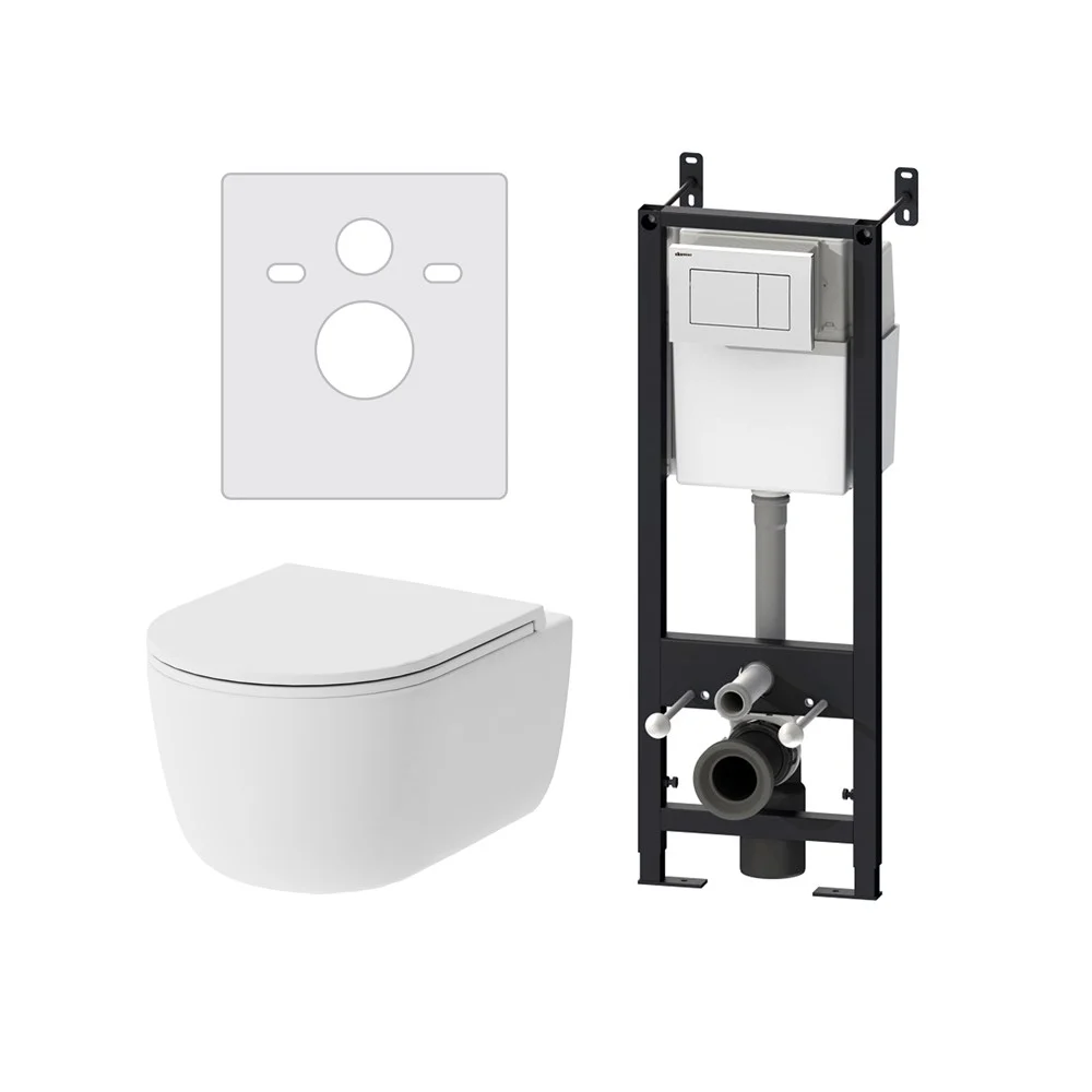 Полностью готовый к установке комплект: система инсталляции с клавишей подвесной унитаз с сиденьем. Неразборная рама из стального профиля выдерживает нагрузку до 400 кг. Полностью изолированный бачок с двухрежимной смывной арматурой. Укомплектован механической клавишей в цвете белый. В комплекте все необходимые патрубки и крепления а также прокладка между унитазом и стеной - звукоизоляция.