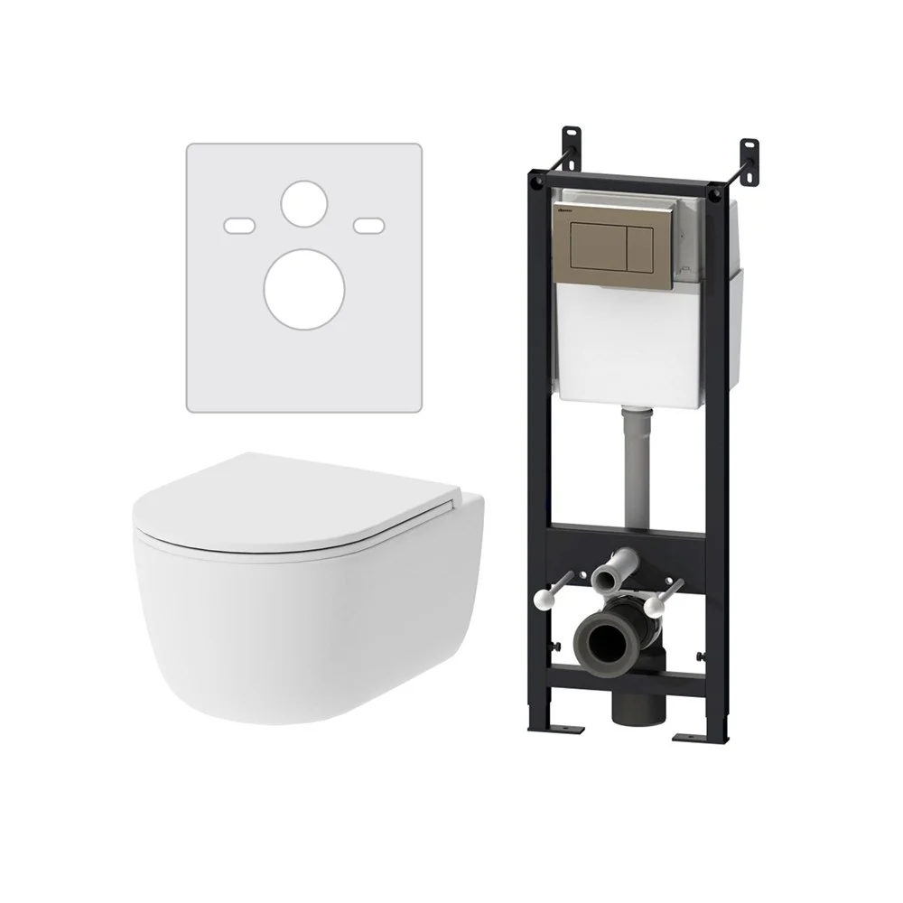 Полностью готовый к установке комплект: система инсталляции с клавишей подвесной унитаз с сиденьем. Неразборная рама из стального профиля выдерживает нагрузку до 400 кг. Полностью изолированный бачок с двухрежимной смывной арматурой. Укомплектован механической клавишей в цвете глянцевый хром. В комплекте все необходимые патрубки и крепления а также прокладка между унитазом и стеной - звукоизоляция.