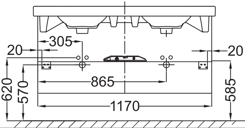 1 отверстие для смесителя, 3 дополнительных отверстия размечены