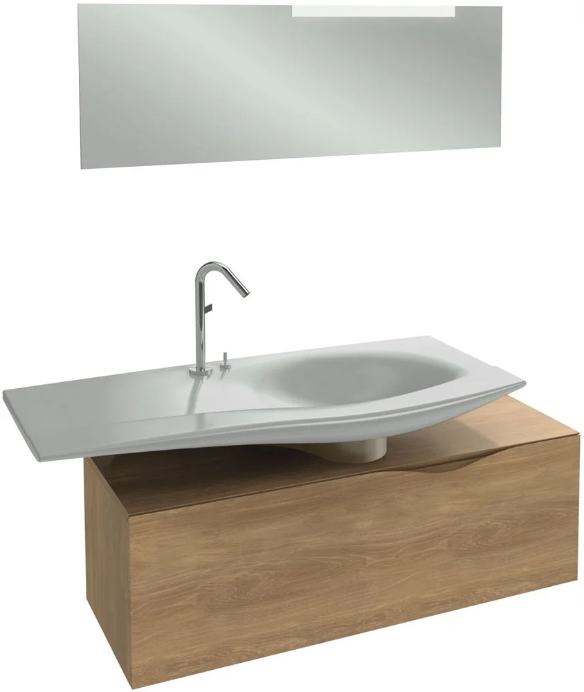 Раковина-столешница Stillness E1292-09-00 без отверстия для ручки донного клапана. Размер 120x52х10 см. Уникальный динамичный дизайн. Модель с отверстием для смесителя, без отверстия для ручки донного клапана. Имеется модель с отверстием для смесителя и отверстием для ручки донного клапана E1292-00.