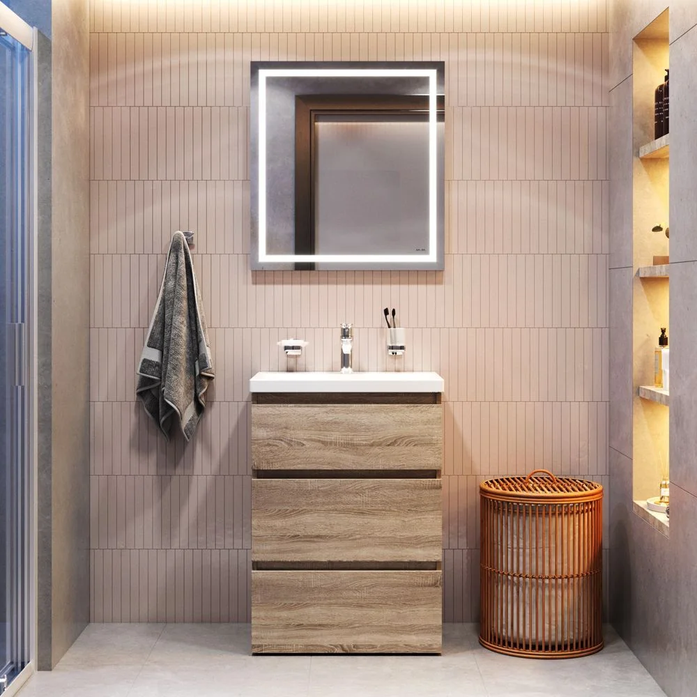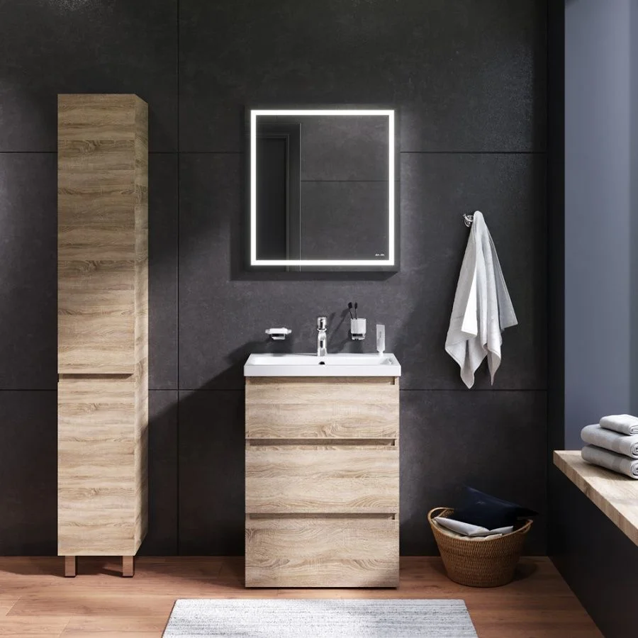 Современный европейский дизайн этого комплекта разработан престижным агентством DanelonMeroni (Великобритания/Италия). Уникальный нижний ящик мебельной тумбы может быть использован как: выдвижная подставка для детей для удобного мытья рук дополнительная ниша для хранения. Комплект дополнен смесителем с узнаваемой шестигранной формой ручки которая сразу выделяется среди смесителей в доступном сегменте.