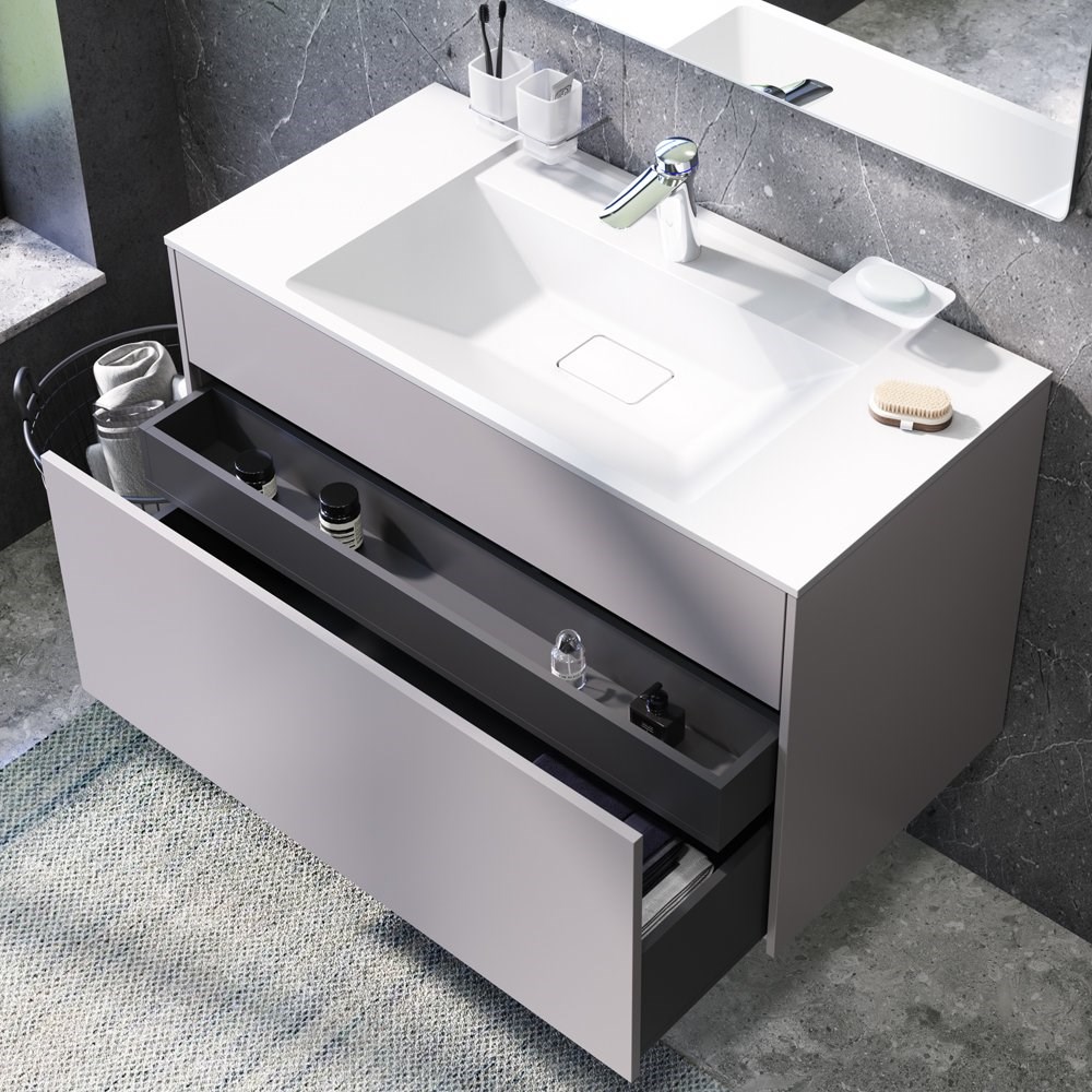 Ультратонкая раковина эргономичной формы с матовым покрытием из мрамора идеально сочетается с мебельной базой. Мебель покрыта экологически чистыми и долговечными полиакриловыми эмалями: специальная технология покраски в 7 слоев превосходит технологию нанесения автоэмали у ведущих немецких марок и обеспечивает насыщенный цвет в течение всего срока службы.
