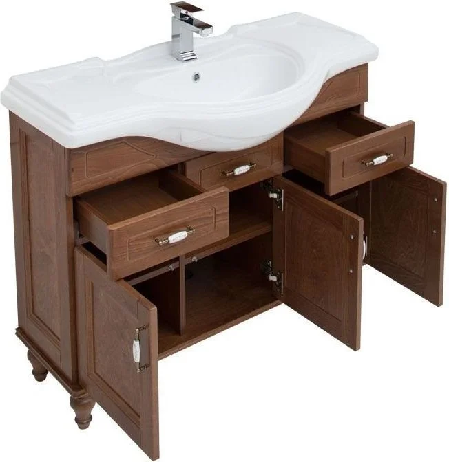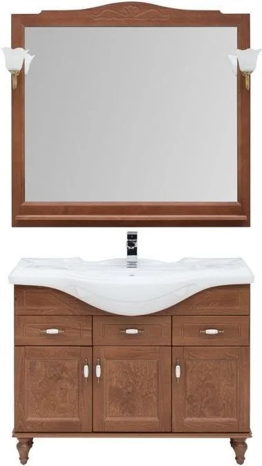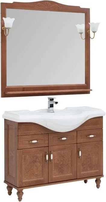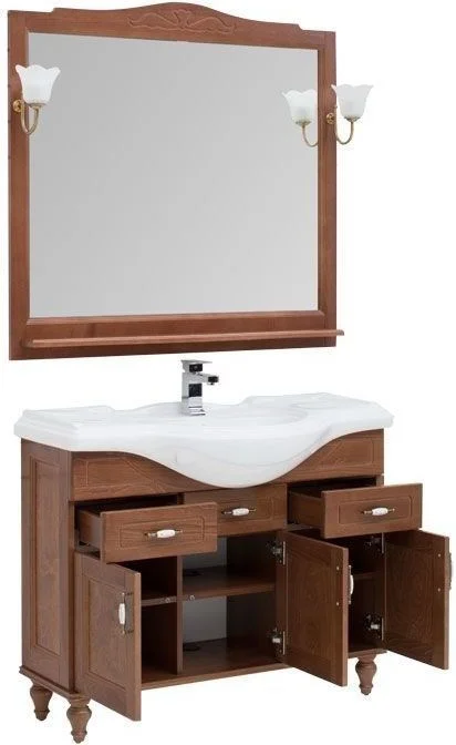 Напольный комплект мебели «Амелия S» (пр-во Aquanet) выполнен из массива бука в цвете «орех». Это обновленная модель коллекции, укомплектованная раковиной-столешницей Yatao. Теплый цвет и текстура натурального дерева воплощают мягкое очарование старины, придают гарнитуру дух аристократизма загородного дома. Рама зеркала и нижняя часть тумбы украшена резными деталями, филенчатые дверцы повторяют орнамент рамочных боковин. Большое удобное зеркало можно укомплектовать двумя бра в виде цветов, которые в комплект не входят. В тумбе шириной 105 см под раковиной предусмотрено 6 вместительных полок и 2 выдвижных ящика, которые позволят разместить все необходимые банные принадлежности. Распашные дверцы и фасады ящиков украшены оригинальными ручками в стиле «винтаж».