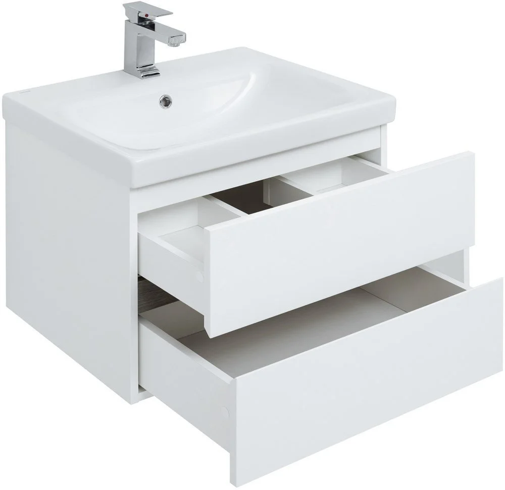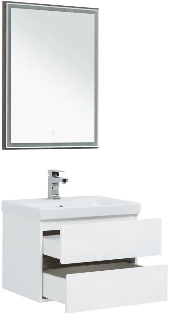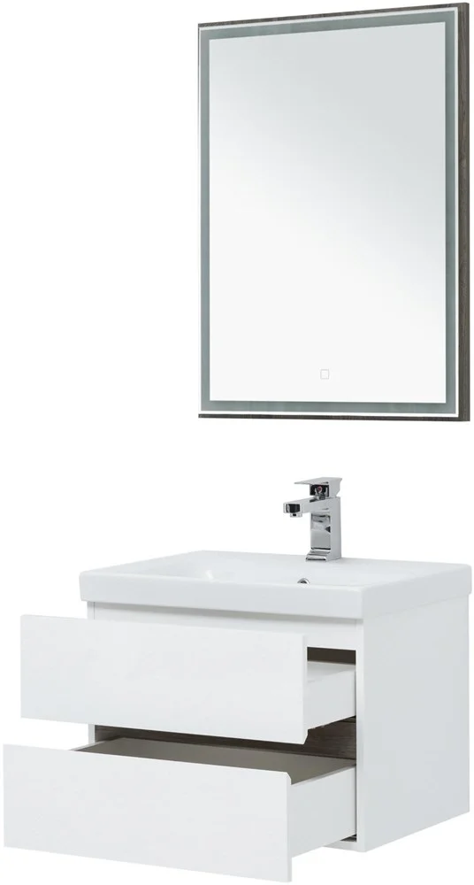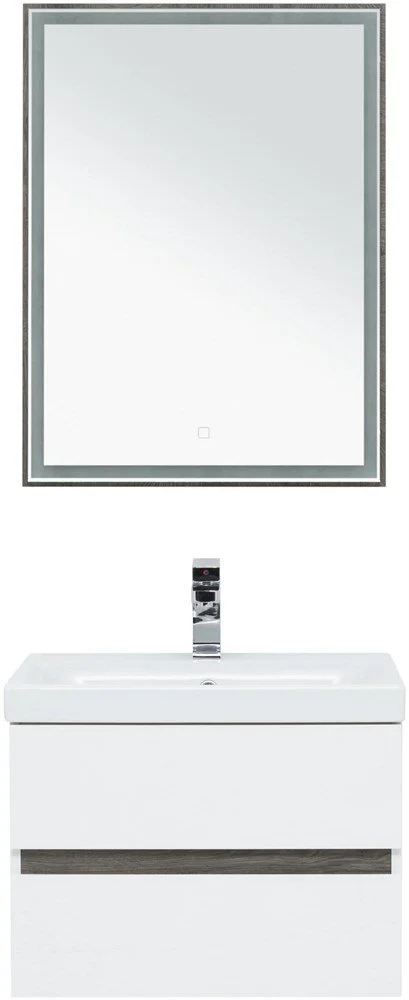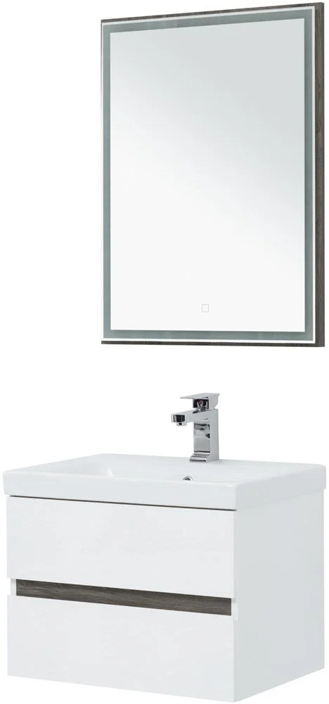 Мебель для ванной Aquanet Беркли 60 белый/дуб рошелье (зеркало белое) имеет изюминку - контрастную декоративную полосу между ящиками в цвете «дуб рошелье». Корпус и фасады тумбы выполнены из влагостойкого ЛДСП и покрыты глянцевой белой эмалью. В конструкции тумбы использованы интегрированные ручки без острых краев и внутренних углов.