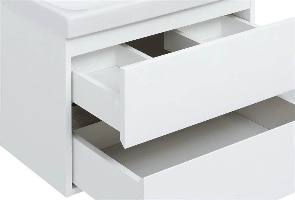 И еще одно важное преимущество: функциональная зона хранения в тумбе шириной 60 см. Она распределена между двумя выдвижными ящиками. Их внутренняя часть выполнена в белом цвете. Верхний ящик – это органайзер, разделенный на три отделения, где удобно хранить мелочи. Нижний более глубокий и позволит сложить полотенца или поставить весь арсенал пеномоющих или гигиенических средств. Ящики оборудованы доводчиками производства германской компании Hettich.