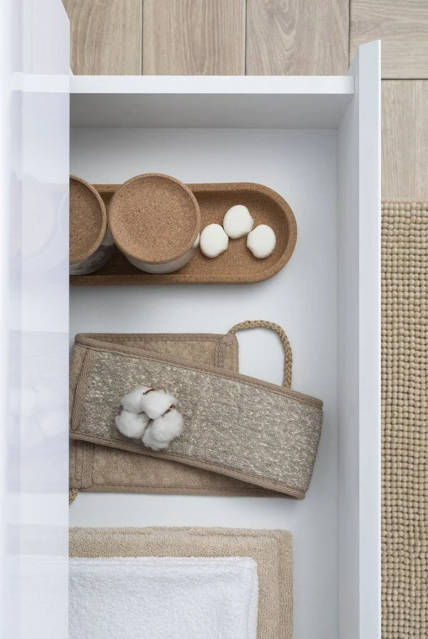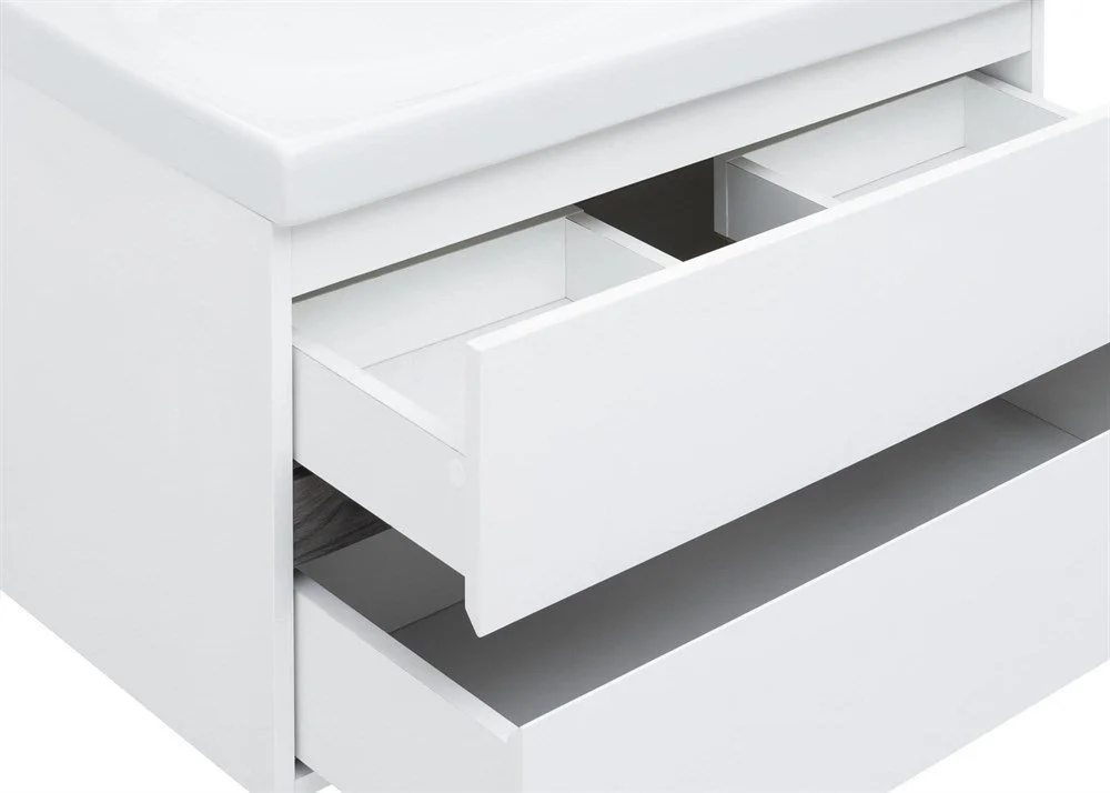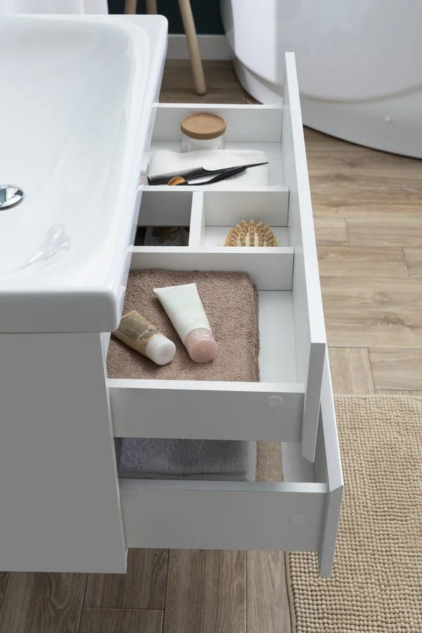 И еще одно важное преимущество: функциональная зона хранения в тумбе шириной 80 см. Она распределена между двумя выдвижными ящиками. Их внутренняя часть выполнена в белом цвете. Верхний ящик – это органайзер, разделенный на три отделения, где удобно хранить мелочи. Нижний более глубокий и позволит сложить полотенца или поставить весь арсенал пеномоющих или гигиенических средств. Ящики оборудованы доводчиками производства германской компании Hettich.