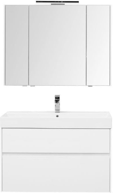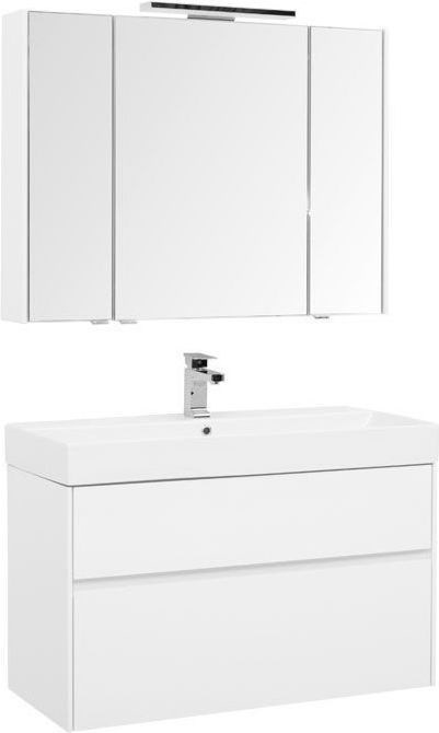 Комплект мебели для ванной Aquanet Бруклин 100 состоит из подвесной тумбы с раковиной и зеркального шкафа - все белого цвета В комплекте соединились модели из разных коллекций: тумба "Бруклин" шириной 100 см и зеркальный шкаф "Латина" шириной 100 см Корпус изделия выполнен из выкрашенного белой краской влагостойкого ЛДСП, фасады – из МДФ В тумбе интегрированные ручки, когда открывание происходит за счет выступающей детали верхней или нижней части фасада, которая срезана под углом, в результате чего образуется выемка, служащая ручкой Раковина из керамики с тонкими изящными бортиками идет размер в размер с тумбой, в результате чего все изделие выглядит как единое целое На контрасте с белизной внешних деталей стильно смотрится корпус выдвижных ящиков, выполненный в цвете «дуб сонома» Нижний ящик тумбы имеет большую зону хранения, верхний разделен на несколько отделений, которые помогут грамотно разложить все необходимое по своим местам