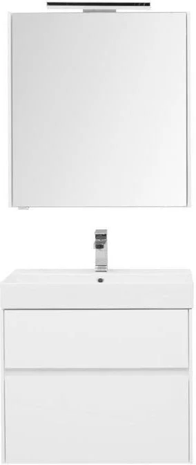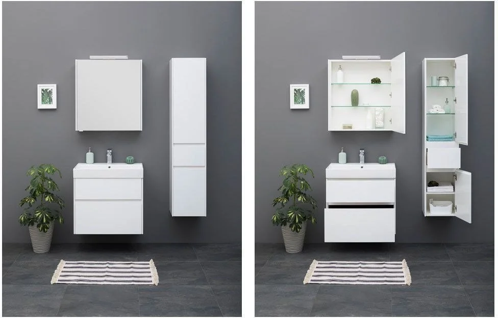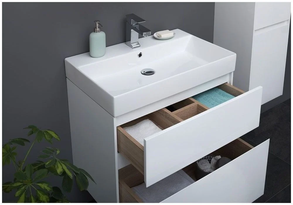 Комплект мебели для ванной Aquanet Бруклин 70 состоит из подвесной тумбы с раковиной и зеркального шкафа - все белого цвета В комплекте соединились модели из разных коллекций: тумба "Бруклин" шириной 70 см и зеркальный шкаф "Латина" шириной 70 см Корпус изделия выполнен из выкрашенного белой краской влагостойкого ЛДСП, фасады – из МДФ В тумбе интегрированные ручки, когда открывание происходит за счет выступающей детали верхней или нижней части фасада, которая срезана под углом, в результате чего образуется выемка, служащая ручкой Раковина из керамики с тонкими изящными бортиками идет размер в размер с тумбой, в результате чего все изделие выглядит как единое целое На контрасте с белизной внешних деталей стильно смотрится корпус выдвижных ящиков, выполненный в цвете «дуб сонома» Нижний ящик тумбы имеет большую зону хранения, верхний разделен на несколько отделений, которые помогут грамотно разложить все необходимое по своим местам