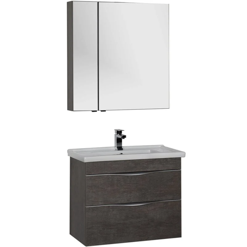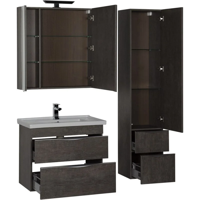 Гарнитур для ванной комнаты Эвора заметно отличается от всех, созданных Aquanet ранее, и имеет отделку фасада и корпуса в цвете и структуре натурального дерева — «дуб антик». Мебель с благородным шоколадным оттенком отделки наделяет ванную комнату уютом и создает атмосферу истинной роскоши. Подвесной комплект мебели включает в себя тумбу с вместительными выдвижными ящиками, зеркало-шкаф с внутренними отделениями и пенал, приобретаемый по желанию. Обратите внимание на нестандартную форму сияющих хромированных ручек. По традиции, все дверки закрываются легко и плавно, чему способствует механизм доводчика. Широкая керамическая раковина производства известного бренда Sanovit играет роль столешницы. Акванет Эвора подвешивается к стене. Если вам интереснее напольный вариант, необходимо дополнительно приобрести комплект ножек.