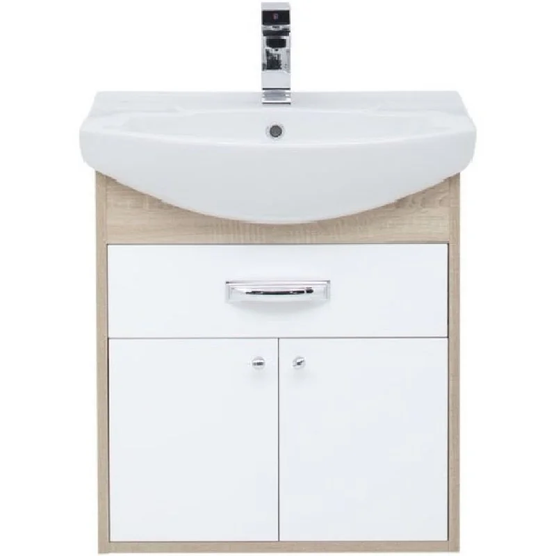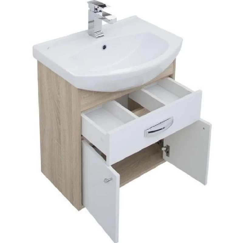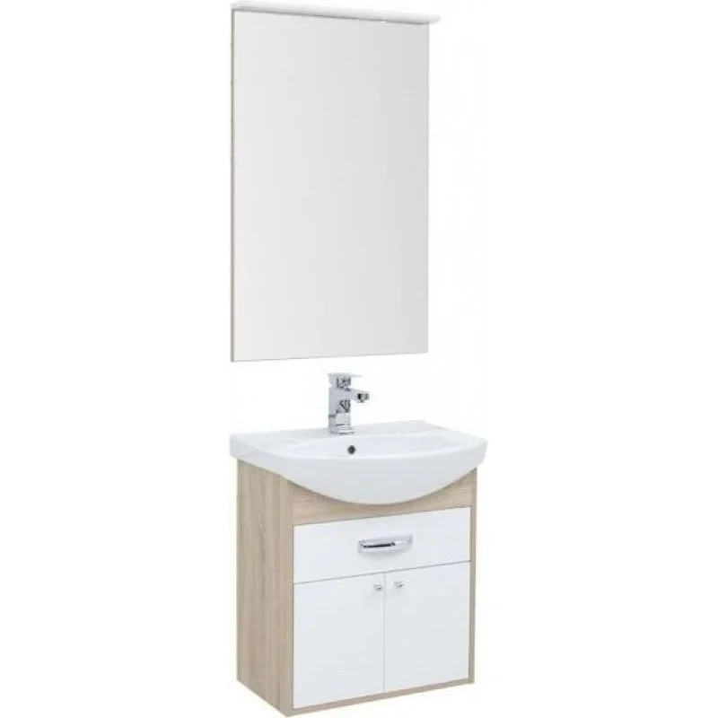 Комплект мебели Aquanet Грейс 60, цвет - дуб сонома/белый, (1 ящик, 2 дверцы) выполнен в цветовом сочетании белого глянца с древесной фактурой «дуб сонома». Светлый оттенок дуба сонома внесет в помещение легкость и свет. Его фактура отличается крупным рисунком древесины и характерным рельефом. В цветовой гамме преобладают золотистые, серые и дымчатые оттенки, что красиво аккомпанирует с белыми глянцевыми поверхностями. Внутреннее пространство тумбы очень функционально: выдвижной ящик вверху с отделениями под мелочь и распашные дверцы внизу с аккуратными круглыми ручками как кнопочки. В комплекте с тумбой предусмотрена керамическая раковина «Элеганс» с обрамлением. Зеркало шириной 60 см с торцевыми деталями в цвете дуб сонома выглядит достойно. Оно оснащено верхним козырьком из МДФ, в который встроен LED-светильник. <