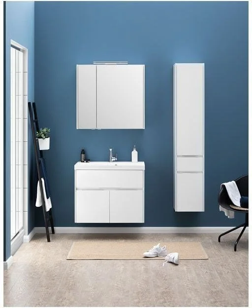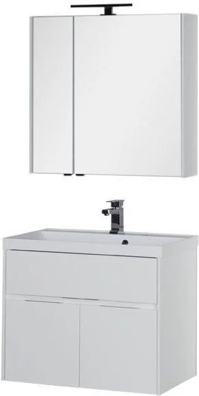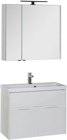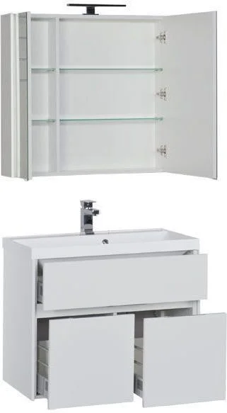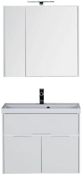 Мебельный комплект Акванет Латина — новое предложение для тех, кто решил создать ванную комнату в стиле «модерн». Вместительные отделения трех выдвижных ящиков тумбы сокроют в себе белье и полотенца, а зеркало-шкаф позволит хранить необходимые для ежедневной гигиены принадлежности непосредственно «под рукой». Ящики новых коллекций мебели Aquanet снабжены доводчиками плавного закрывания. Среди достоинств комплекта также хромированные ручки ящиков и глубокая прямоугольная раковина из литьевого мрамора, что очень актуально для современных интерьеров. Белое глянцевое покрытие «Латины» соответствует представлениям о чистоте и здоровье и гармонирует с белизной ванны, кабины или душевого уголка в ванной комнате. Мягкое, в то же время достаточное по силе освещение создают экономичные внешние светильники.