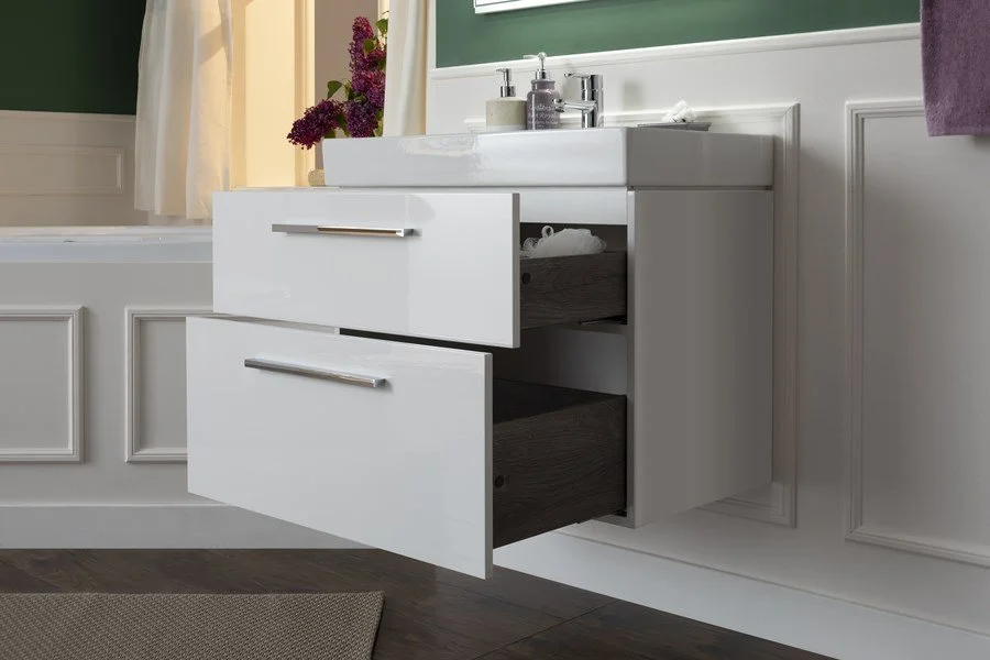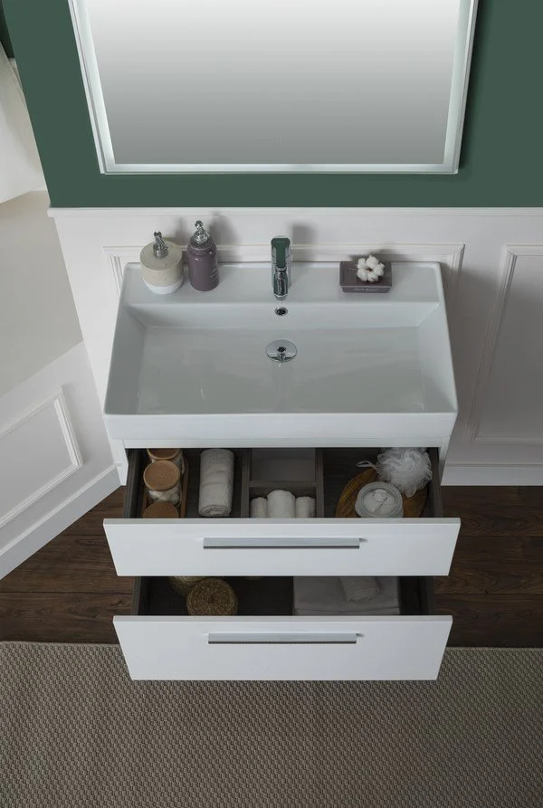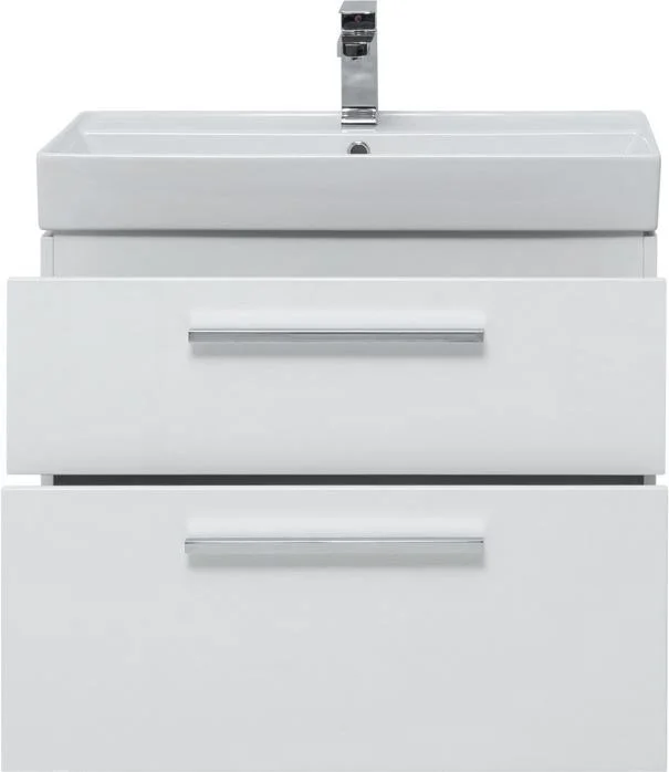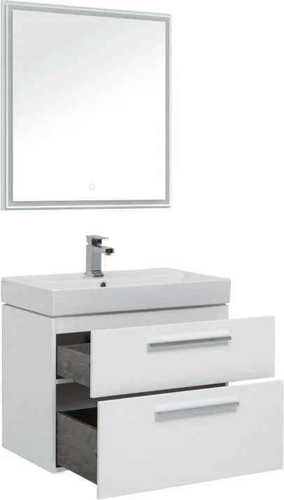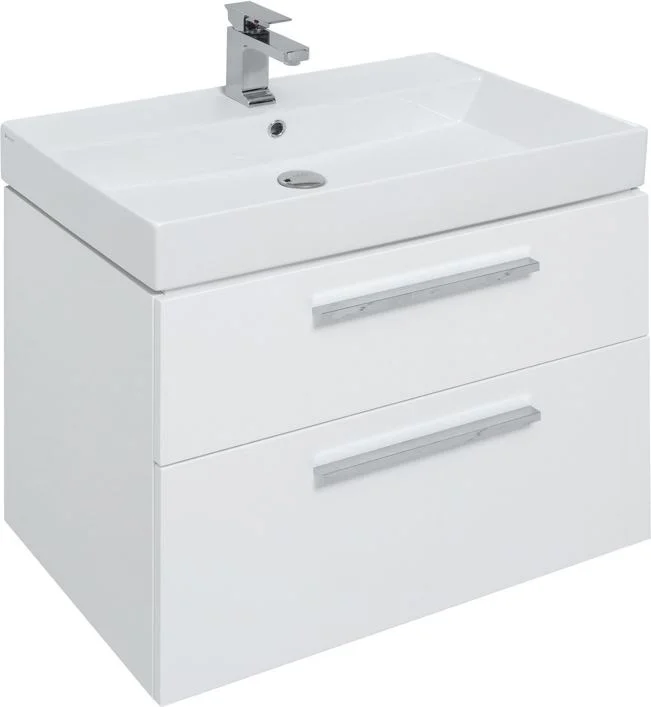Мебель для ванной Aquanet Nova 75 в белом глянце изготовлена из влагостойкой ламинированной древесно-стружечной плиты и предназначена для использования в помещениях с повышенной влажностью. Тумбу Nova можно повесить на стену или установить ее на ножки. Для этого их необходимо приобрести дополнительно. Причем, есть выбор: купить белые ножки или черные матовые. В комплекте с тумбой - встраиваемая керамическая раковина «Латина». Эта модель выпускается исключительно для мебели Aquanet. Чаша раковины внутри имеет обтекаемую форму и небольшую платформу с отверстием для смесителя. На нее можно поставить гигиенические принадлежности. Ящики тумбы оборудованы надежными направляющими Hettich Quadro Silent System, которые обеспечивают полное выдвижение. Направляющие с доводчиками, так что при открывании и закрывании ящикам обеспечен плавный ход и отсутствие неприятных стуков. Ручки не входят в комплект, их необходимо приобрести дополнительно, выбрав на свой вкус из четырех доступных цветов: хром глянцевый, хром матовый,