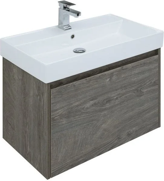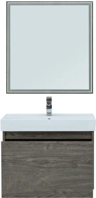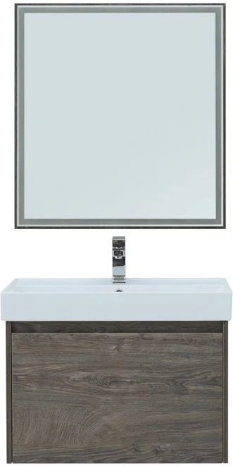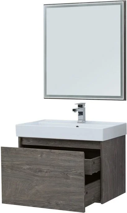 Мебель для ванной Aquanet Nova Lite 75 из влагостойкой ламинированной древесно-стружечной плиты в благородном цвете «дуб рошелье» имеет достойный вид. Фактура натурального дерева выглядит изысканно, а подвесной монтаж придает визуальную легкость тумбе шириной 75 см. Тумба оборудована одним большим ящиком, внутри которого предусмотрен маленький с выемкой для установки сифона и разделителями, где удобно хранить необходимые в ванной комнате мелочи. Фасады выполнены с декоративной интегрированной ручкой, не имеющей острых краев и внутренних углов, что обеспечивает удобство в эксплуатации и легкий уход за мебелью. Ящики комплектуются направляющими немецкого производства Hettich Quadro, оснащенными доводчиками. Неглубокая и стильная керамическая раковина «Латина» идеально подходит к тумбе. Комплект дополняет зеркало с LED-подсветкой по периметру.
