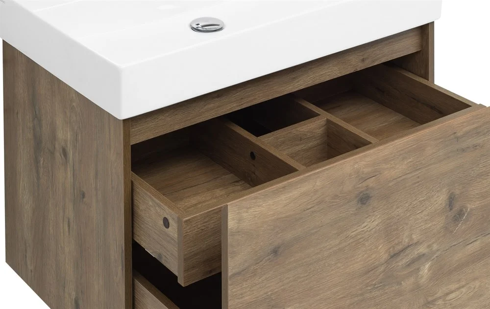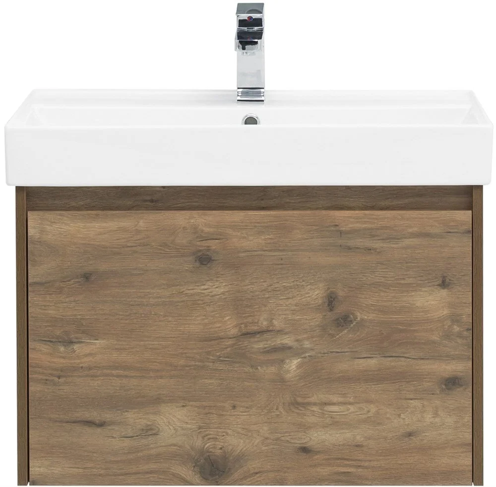Мебель для ванной Aquanet Nova Lite 75 из влагостойкой ламинированной древесно-стружечной плиты в изысканном цвете «дуб рустикальный» имеет достойный вид. Фактура натурального дерева выглядит благородно, а подвесной монтаж придает визуальную легкость тумбе шириной 75 см. Она оборудована одним ящиком, при открывании которого обнаруживается еще один небольшой для мелочей. Фасад выполнен с декоративной интегрированной ручкой, не имеющей острых краев и внутренних углов, что обеспечивает удобство в эксплуатации и легкий уход за мебелью. Ящики комплектуются направляющими немецкого производства Hettich Quadro, оснащенными доводчиками. Неглубокая и стильная керамическая раковина «Латина» идеально подходит к тумбе. В комплекте с тумбой идет зеркало с LED-подсветкой по периметру.