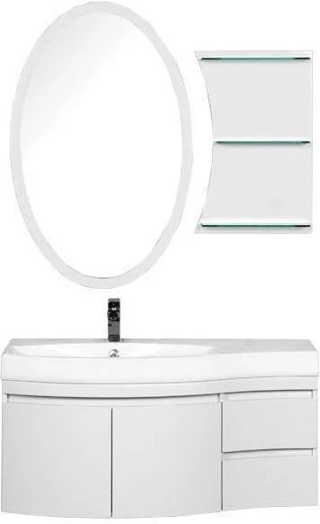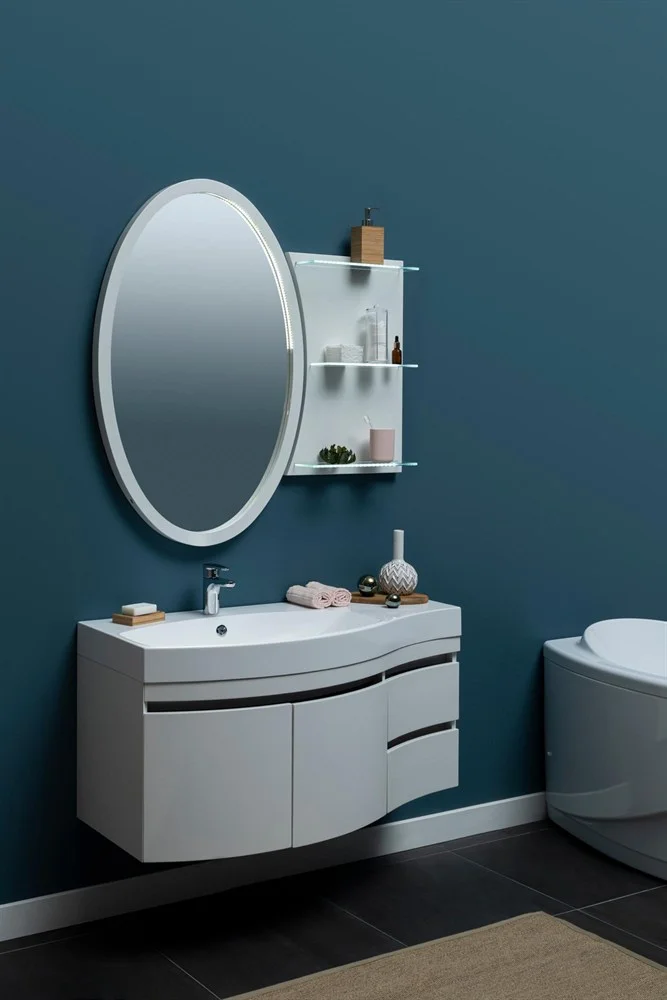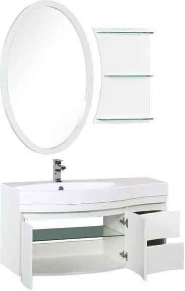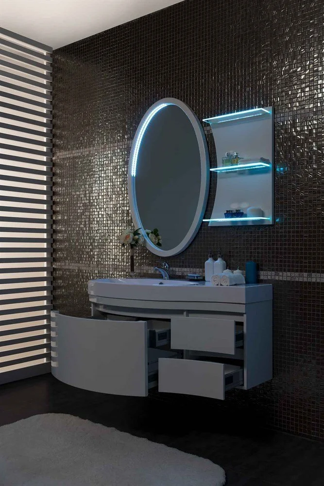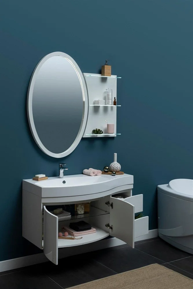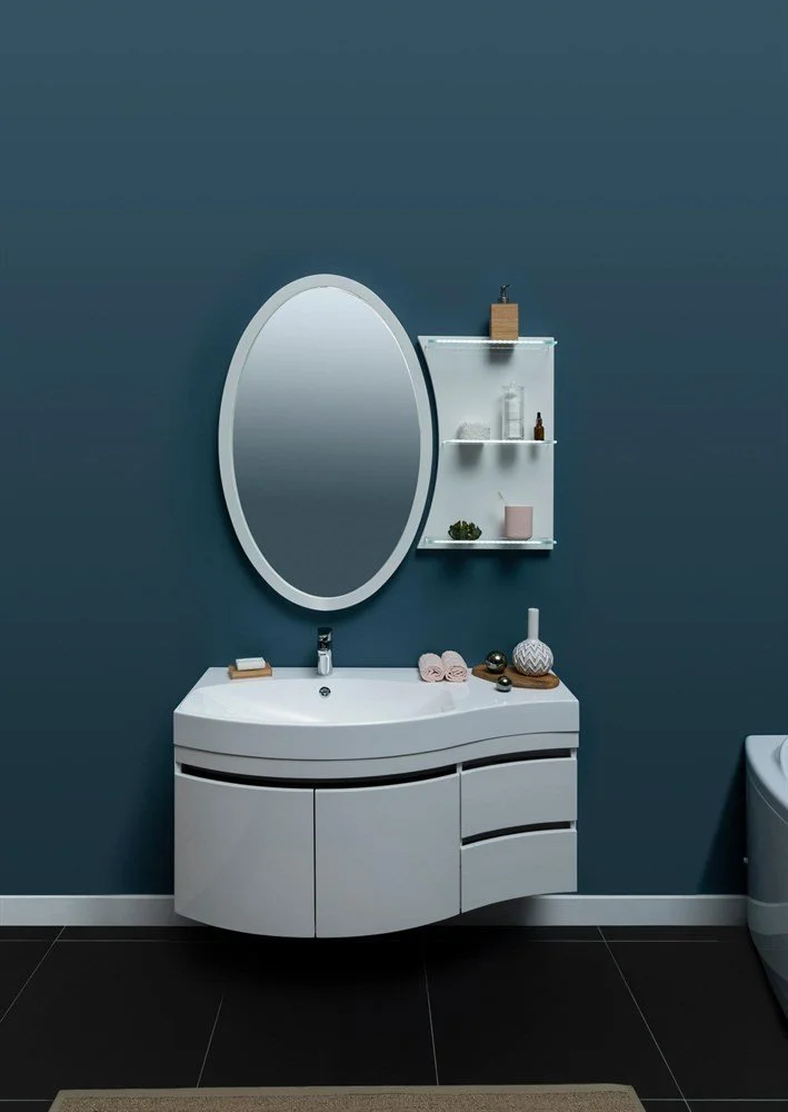 Подвесной набор мебели для ванной комнаты в стиле модерн подойдет тем, кто предпочитает современный, модный интерьер. Обтекаемые формы, лаконичные цвета, оригинальная деталь – ручки в виде прорезей в фасадах, все это выделяет гарнитур Опера, делает его стилистическим центром ванной комнаты. Раковина-столешница из литьевого мрамора повторяет плавные линии тумбы, широкое крыло позволяет с удобством разместить большое количество гигиенических средств и принадлежностей. Комплект имеет как правосторонний, так и левосторонний вариант расположения. Большое овальное зеркало оборудовано встроенной подсветкой. Настенная панель со стеклянными полками дополняет и уравновешивает композицию, а также создает дополнительные места для хранения самых необходимых мелочей.