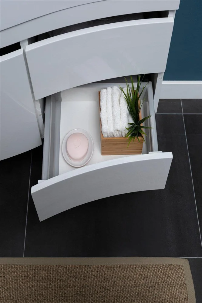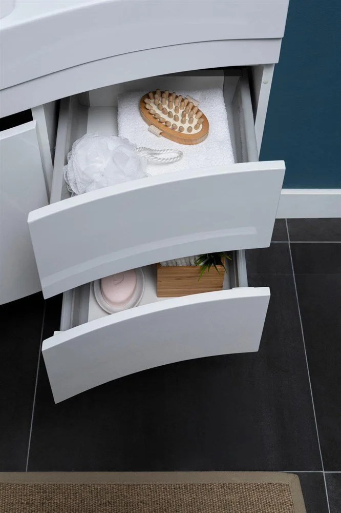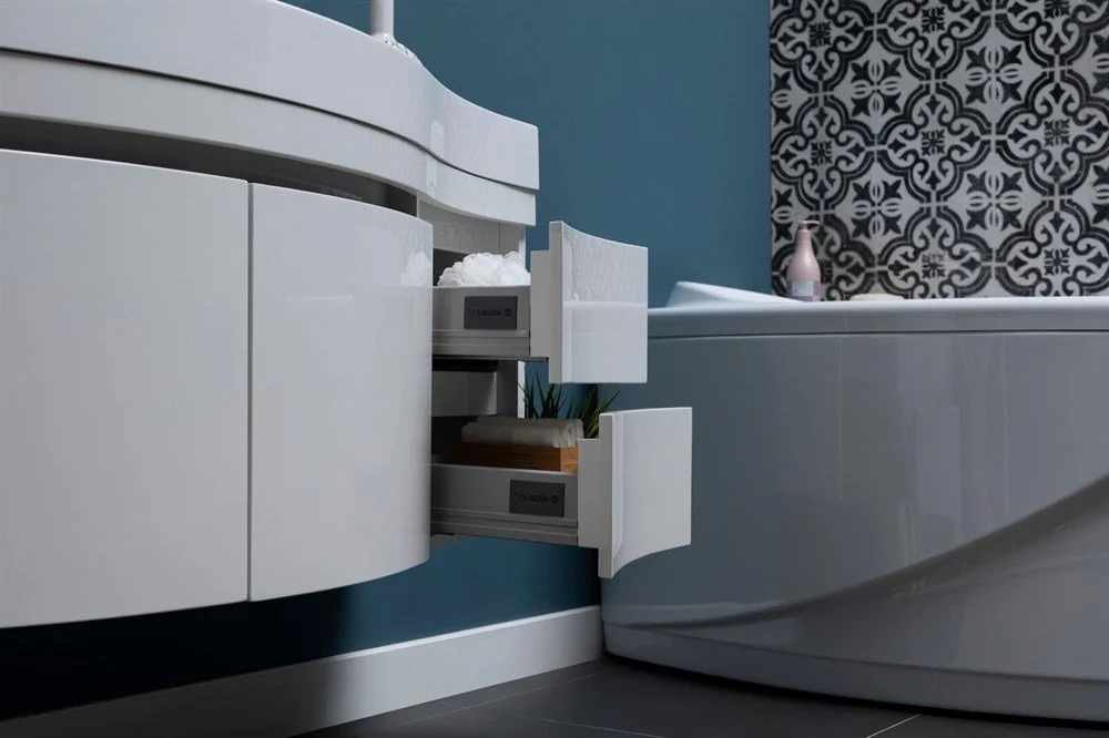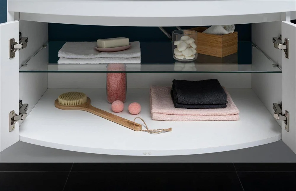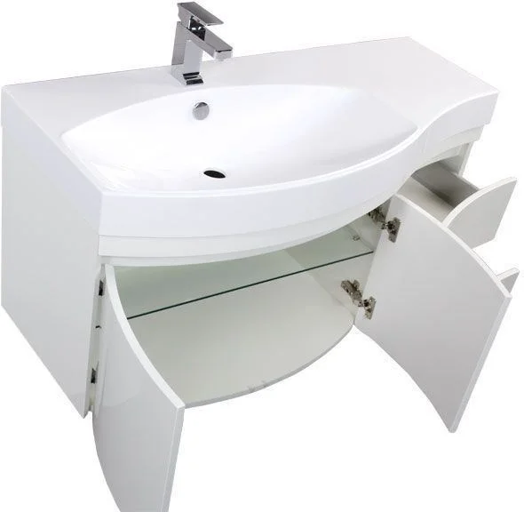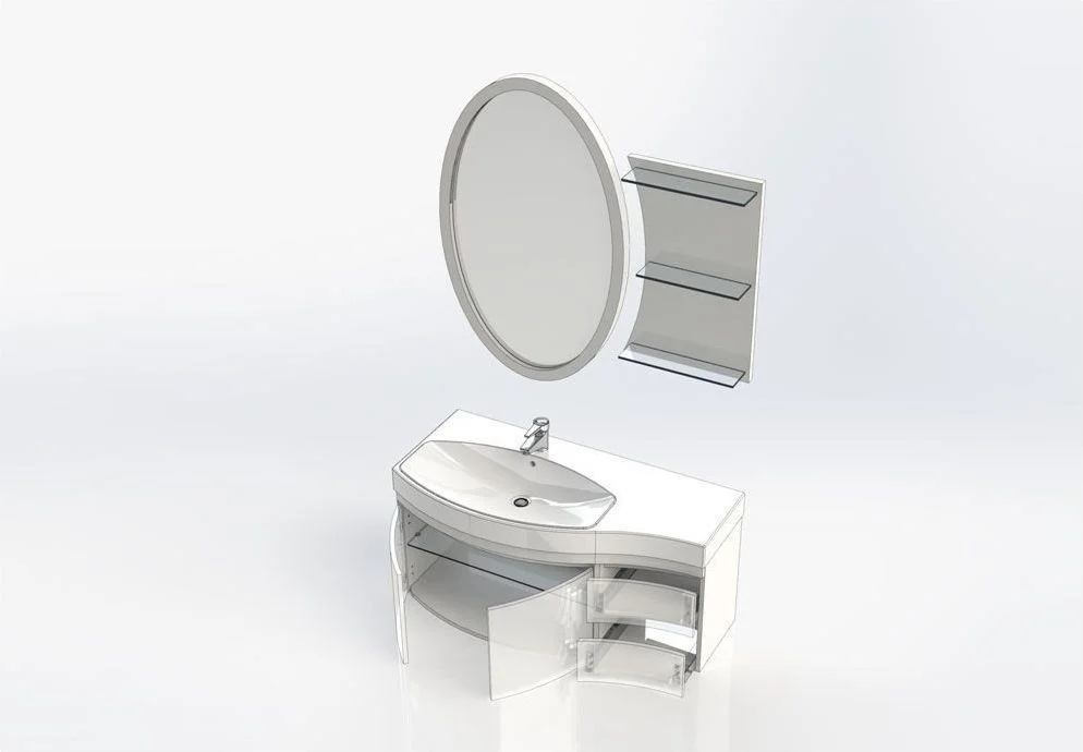 Подвесной набор мебели для ванной комнаты в стиле модерн подойдет тем, кто предпочитает современный, модный интерьер. Обтекаемые формы, лаконичные цвета, оригинальная деталь – ручки в виде прорезей в фасадах, все это выделяет гарнитур Опера, делает его стилистическим центром ванной комнаты. Раковина-столешница из литьевого мрамора повторяет плавные линии тумбы, широкое крыло позволяет с удобством разместить большое количество гигиенических средств и принадлежностей. Комплект имеет как правосторонний, так и левосторонний вариант расположения. Большое овальное зеркало оборудовано встроенной подсветкой. Настенная панель со стеклянными полками дополняет и уравновешивает композицию, а также создает дополнительные места для хранения самых необходимых мелочей.