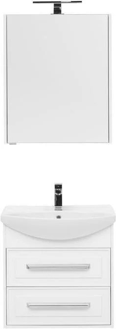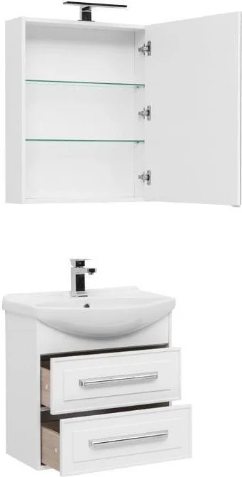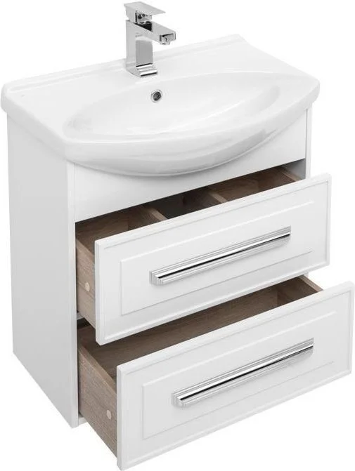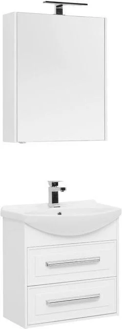 Комплект мебели для ванной Aquanet Остин 65 белого цвета чрезвычайно эффектно смотрится благодаря белым глянцевым фасадам выдвижных ящиков со строгой фрезеровкой. Лаконичные хромированные ручки подчеркивают элегантность узора на фасаде. Особенно хороша в компании с поблескивающим глянцем фасадов белоснежная керамическая раковина чешского бренда Dreja, которая в этом комплекте является не только функциональной деталью, неотъемлемой частью тумбы, но и декоративным элементом. Зона хранения внутри зеркального шкафа поделена на три полочки, две из которых стеклянные, что придает легкость. Комплект станет настоящим украшением интерьера с акцентом на стили ретро, кантри, прованс.