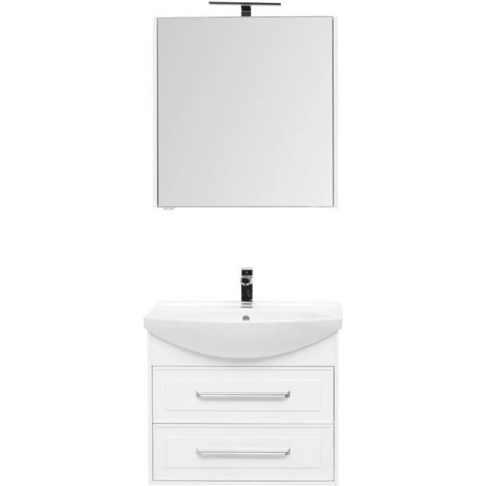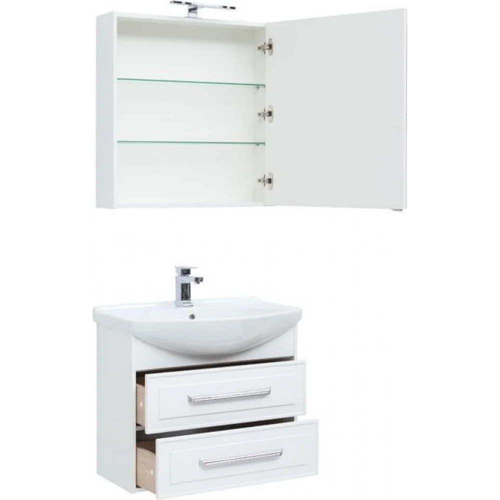 Комплект мебели для ванной Aquanet Остин 75 белого цвета чрезвычайно эффектно смотрится благодаря белым глянцевым фасадам выдвижных ящиков со строгой фрезеровкой. Лаконичные хромированные ручки подчеркивают элегантность узора на фасаде. Особенно хороша в компании с поблескивающим глянцем фасадов белоснежная керамическая раковина чешского бренда Dreja, которая в этом комплекте является не только функциональной деталью, неотъемлемой частью тумбы, но и декоративным элементом. Зона хранения внутри зеркального шкафа поделена на три полочки, две из которых стеклянные, что придает легкость. Комплект станет настоящим украшением интерьера с акцентом на стили ретро, кантри, прованс.