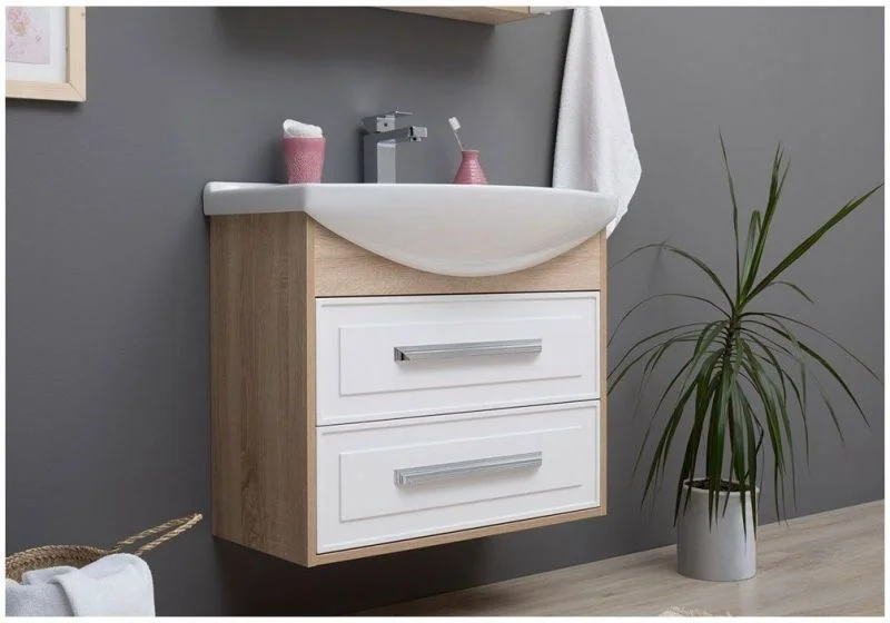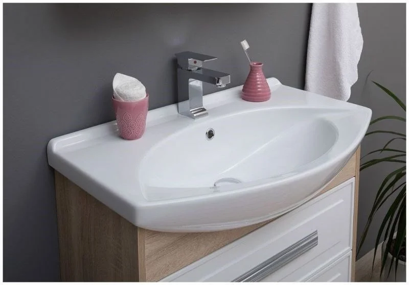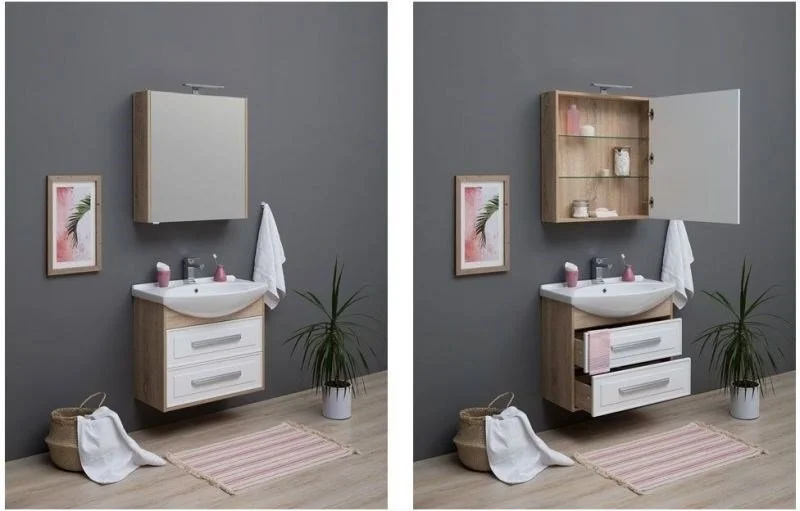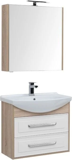 Комплект мебели для ванной Aquanet Остин 75 чрезвычайно эффектно смотрится благодаря мягкому контрасту светлых деревянных деталей корпуса в цвете «дуб сонома» с белыми глянцевыми фасадами выдвижных ящиков со строгой фрезеровкой. Лаконичные хромированные ручки подчеркивают элегантность узора на фасаде. Особенно хороша на этом фоне белоснежная керамическая раковина чешского бренда Dreja, которая в этом комплекте является не только функциональной деталью, неотъемлемой частью тумбы, но и декоративным элементом. Зона хранения внутри зеркального шкафа поделена на три полочки, две из которых стеклянные, что придает легкость. Комплект станет настоящим украшением интерьера с акцентом на стили ретро, кантри, прованс.