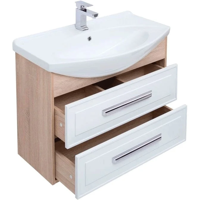 Комплект мебели для ванной Aquanet Остин 85 в цвете "дуб сонома/белый" чрезвычайно эффектно смотрится благодаря мягкому контрасту светлых деревянных деталей корпуса в цвете «дуб сонома» с белыми глянцевыми фасадами выдвижных ящиков со строгой фрезеровкой. Лаконичные хромированные ручки подчеркивают элегантность узора на фасаде. Особенно хороша на этом фоне белоснежная керамическая раковина чешского бренда Dreja, которая в этом комплекте является не только функциональной деталью, неотъемлемой частью тумбы, но и декоративным элементом. Зона хранения внутри зеркального шкафа поделена на две секции, в каждой из которых предусмотрены стеклянные полочки, что придает легкость. Комплект станет настоящим украшением интерьера с акцентом на стили ретро, кантри, прованс.