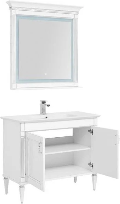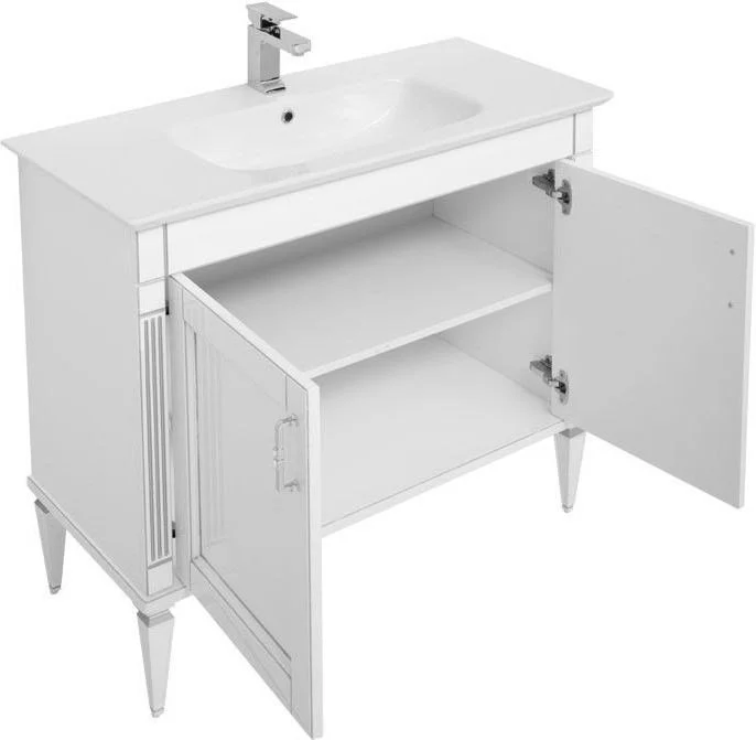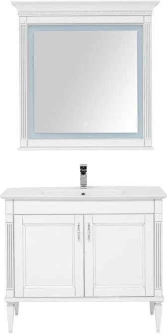 Комплект мебели для ванной Aquanet Селена 105 белый/серебро (2 дверцы) с эффектным патинированием серебром, с живописными украшениями в виде искусной фрезеровки по фасадам и корпусу, с замысловатыми ручками, украшенными кристаллами Swarovski, впечатляет с первого взгляда. Это яркий образец классической мебели. Тумба шириной 105 см выполнена с двумя распашными дверцами, за которыми скрывается просторная зона хранения, а также с дверцами и выдвижными ящиками – кому как больше нравится. Для модели подобрана новинка из ассортимента турецкого производителя Sanovit - керамическая накладная раковина из коллекции Sharp. Ее отличает тонкий изящный край, широкие борта, которые вполне могут стать подобием полочки для размещения средств ежедневной гигиены. В базовую комплектацию набора мебели «Селена» входит также зеркало, которое имеет встроенную LED-подсветку с сенсорным выключателем. Рамка, в которую обрамлено зеркало, снабжена декоративными элементами и имеет небольшую полочку. Все модели коллекции имеют напольную ус