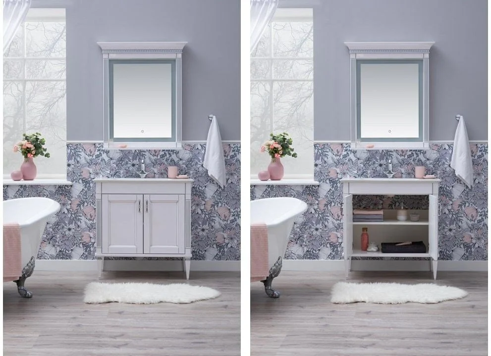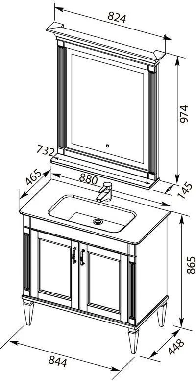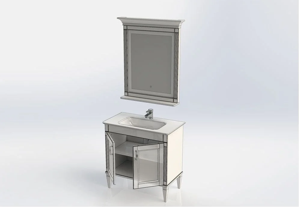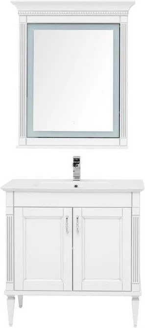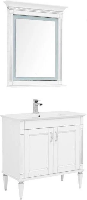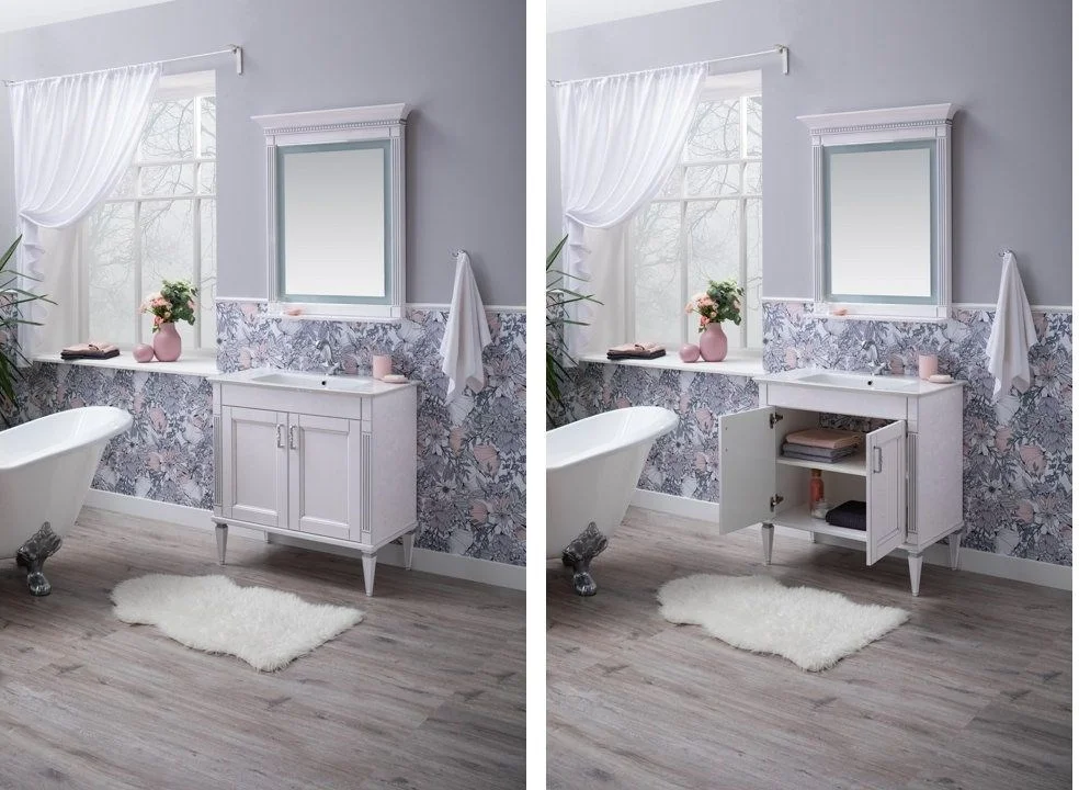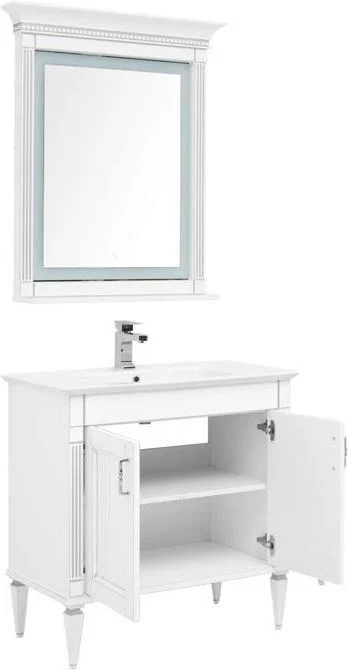 Комплект мебели для ванной Aquanet Селена 90 белый/серебро с эффектным патинированием серебром, с живописными украшениями в виде искусной фрезеровки по фасадам и корпусу, с замысловатыми ручками, украшенными кристаллами Swarovski, впечатляет с первого взгляда. Это яркий образец классической мебели. При ширине 90 см тумба снабжена двумя распашными дверцами, за которыми размещается просторная зона хранения. Для модели подобрана новинка из ассортимента турецкого производителя Sanovit - керамическая накладная раковина из коллекции Sharp. Ее отличает тонкий изящный край, широкие борта, которые вполне могут стать подобием полочки для размещения средств ежедневной гигиены. В базовую комплектацию набора мебели «Селена» входит также зеркало, которое имеет встроенную LED-подсветку с сенсорным выключателем. Рамка, в которую обрамлено зеркало, снабжена декоративными элементами и имеет небольшую полочку. Все модели коллекции имеют напольную установку. Причем, ножки, на которые они устанавливаются, также являются декоратив