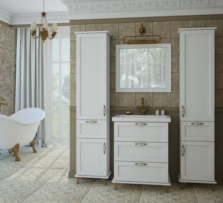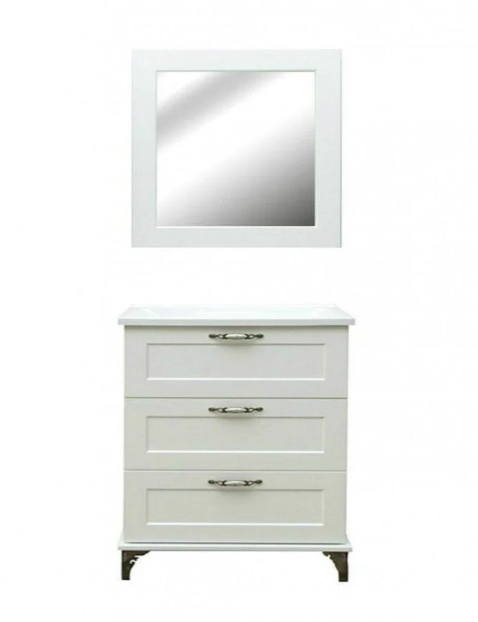 Мебельный комплект Эстет Bali Classic 80 белый, вобрал в себя дизайнерские находки прошлых веков, качественные современные материалы и изысканную «винтажную» фурнитуру. Напольная тумба с эргономичной раковиной из искусственного камня и тремя выдвижными ящиками с системой плавного закрывания, обеспечивает удобную зону хранения и приема гигиенических процедур. Большое зеркало в раме над тумбой служит завершающим штрихом мебельного гарнитура.Размеры: