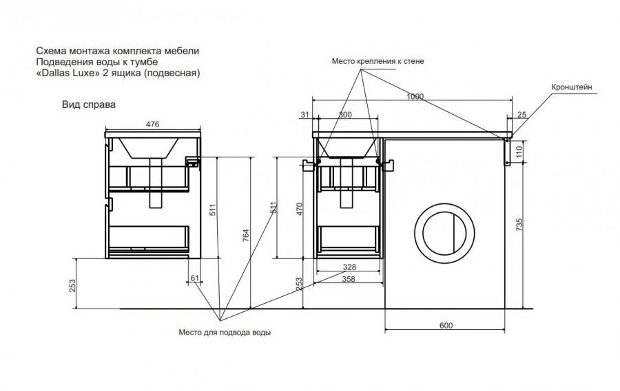 - Тумба подвесная 2 ящика (ш/в/г): 358x607x476 мм