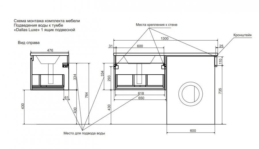 - Тумба подвесная 1 ящик (ш/в/г): 648x430x476 мм