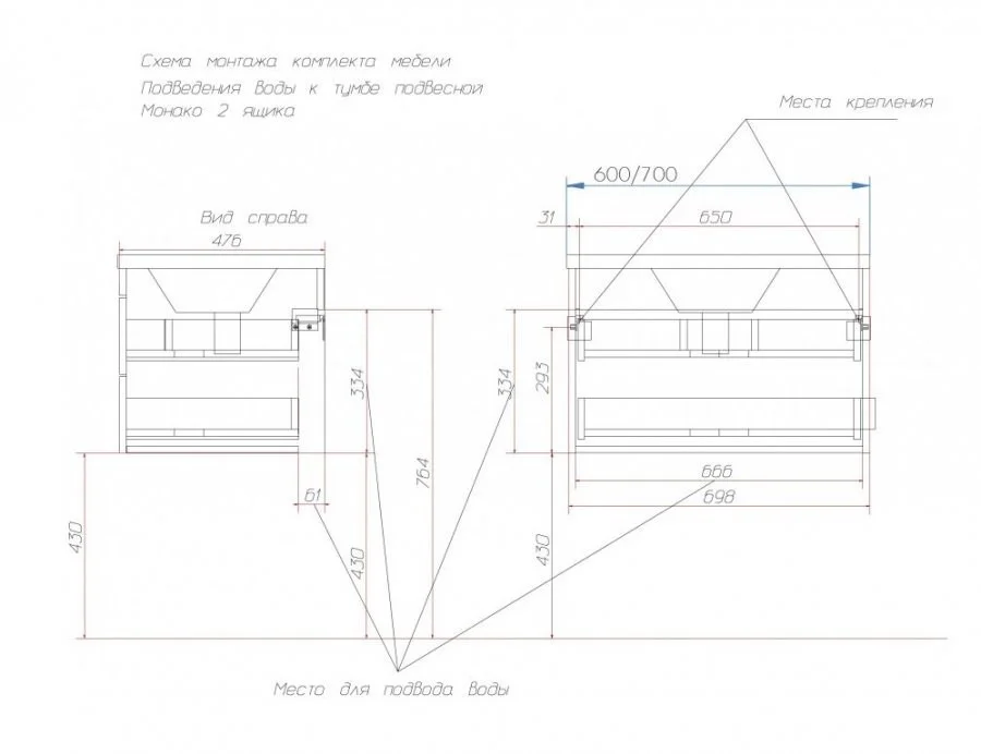- Тумба подвесная 2 ящика (ш/в/г): 598х430х476 мм