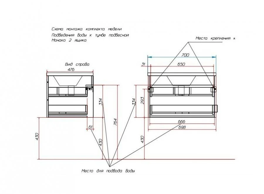 - Тумба подвесная 2 ящика (ш/в/г): 698х430х476 мм