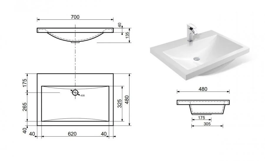 - Раковина Эстет Монако 70 (ш/в/г): 700x135x480 мм