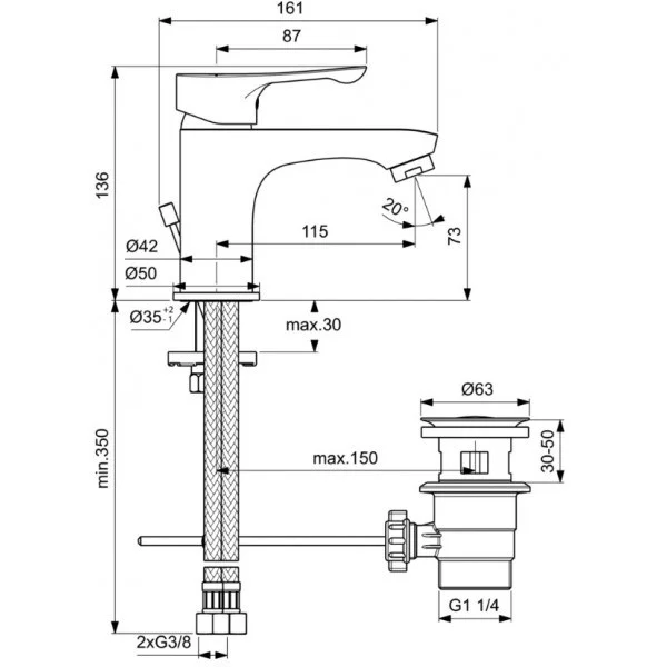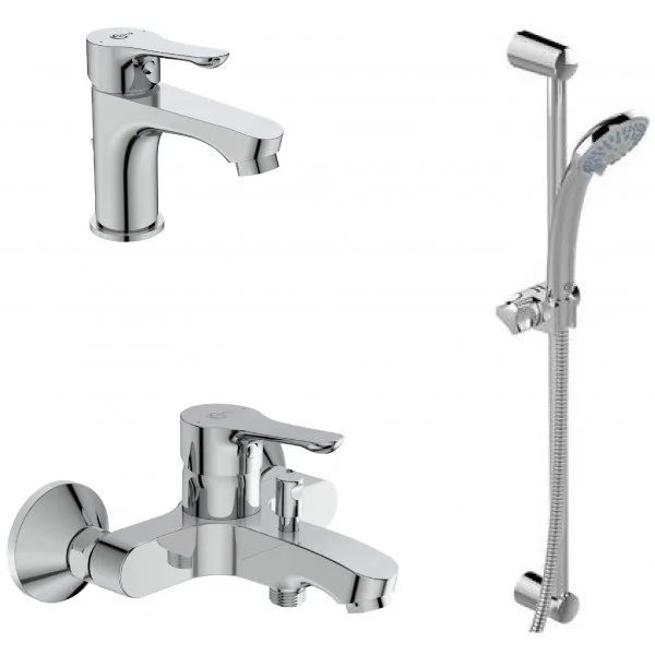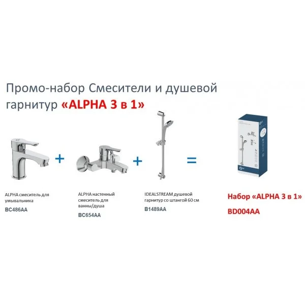 ALPHA Промо комплект, состоящий из: BC486AA ALPHA Смеситель для умывальника с металлическим донным клапаном, система монтажа EASY-FIX (облегченный монтаж), гибкая подводка G3/8" (шланги PEX), металлический донный клапан, металлическая рукоятка с индикаторами горячей/холодной воды; BC654AA ALPHA Настенный смеситель для ванны и душа, стандартный настенный монтаж, металлические накладки, без душевого гарнитура, металлическая рукоятка с индикаторами горячей/холодной воды, автоматическое переключение; B1489AA IDEALSTREAM Душевой гарнитур, состоящий из 3-функциональной душевой лейки O80 мм, штанги 600 мм, O21 мм, пластикового слайдера, шланга для душа 1500 мм