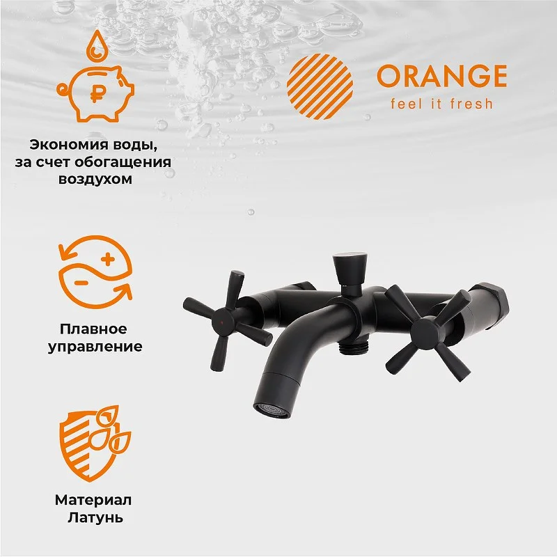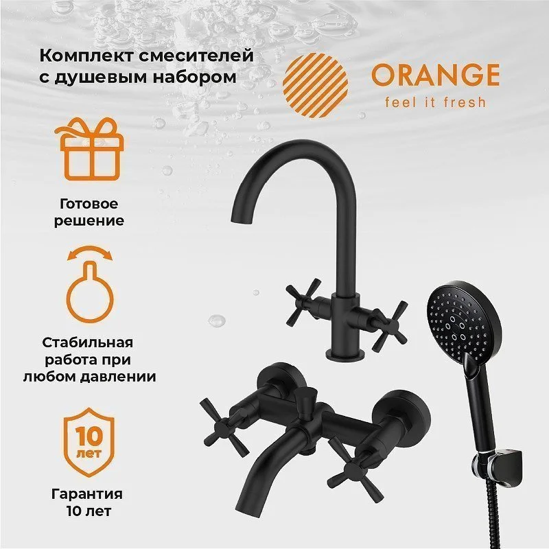 Набор смесителей для ванной комнаты Mia от немецкой компании Orange – отличный выбор для современного интерьера. Латунное изделие устойчиво к коррозии и высоким температурам, а черное матовое покрытие делает незаметными разводы и высохшие капли. Керамические кран-буксы обеспечивает долговечность изделия, стабильную подачу воды и мощный напор. Излив оснащен пластиковым аэратором, он создает ровную мощную струю и легко очищается от известкового налета. В комплекте Душевой гарнитур: душевая лейка d 110 мм (3 режима струи, защита от известкового налета RUB CLEAN, с системой AIR IN), шланг в металлической оплетке 1500 мм с защитой от перекручивания, настенный держатель лейки с регулировкой угла наклона.