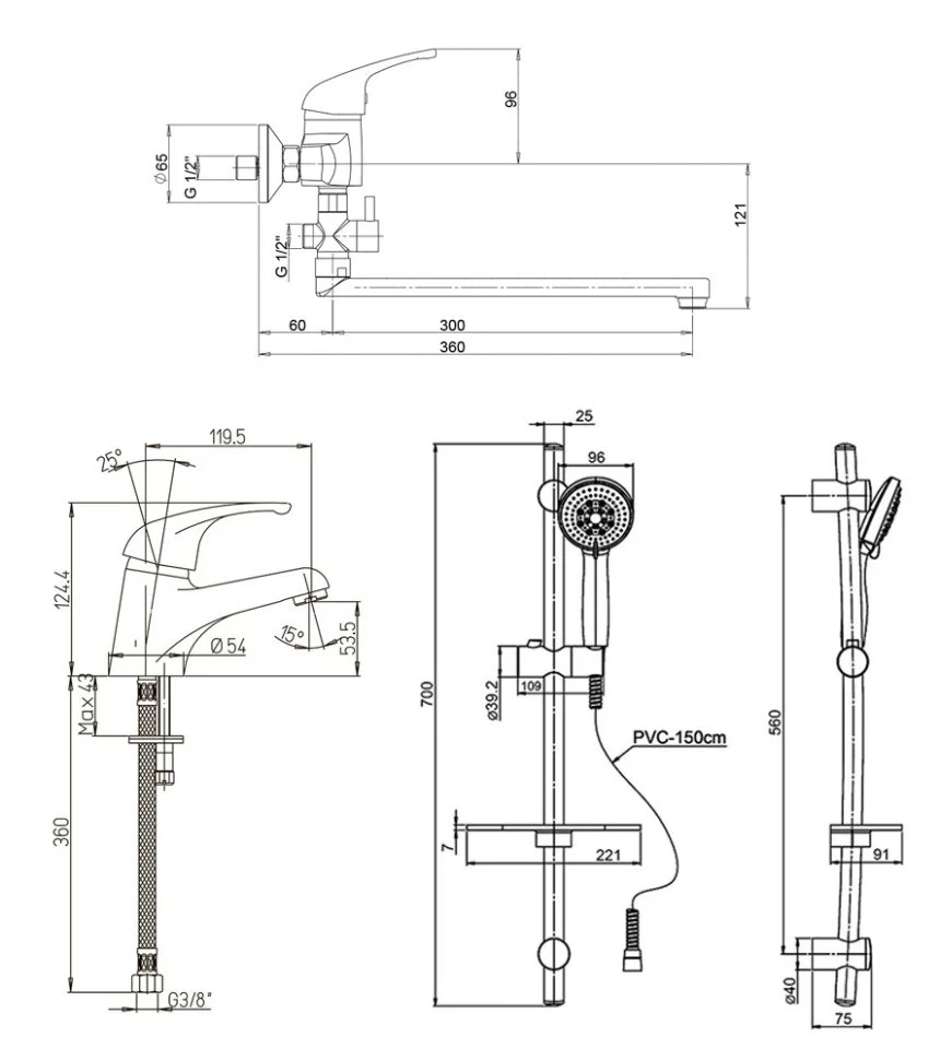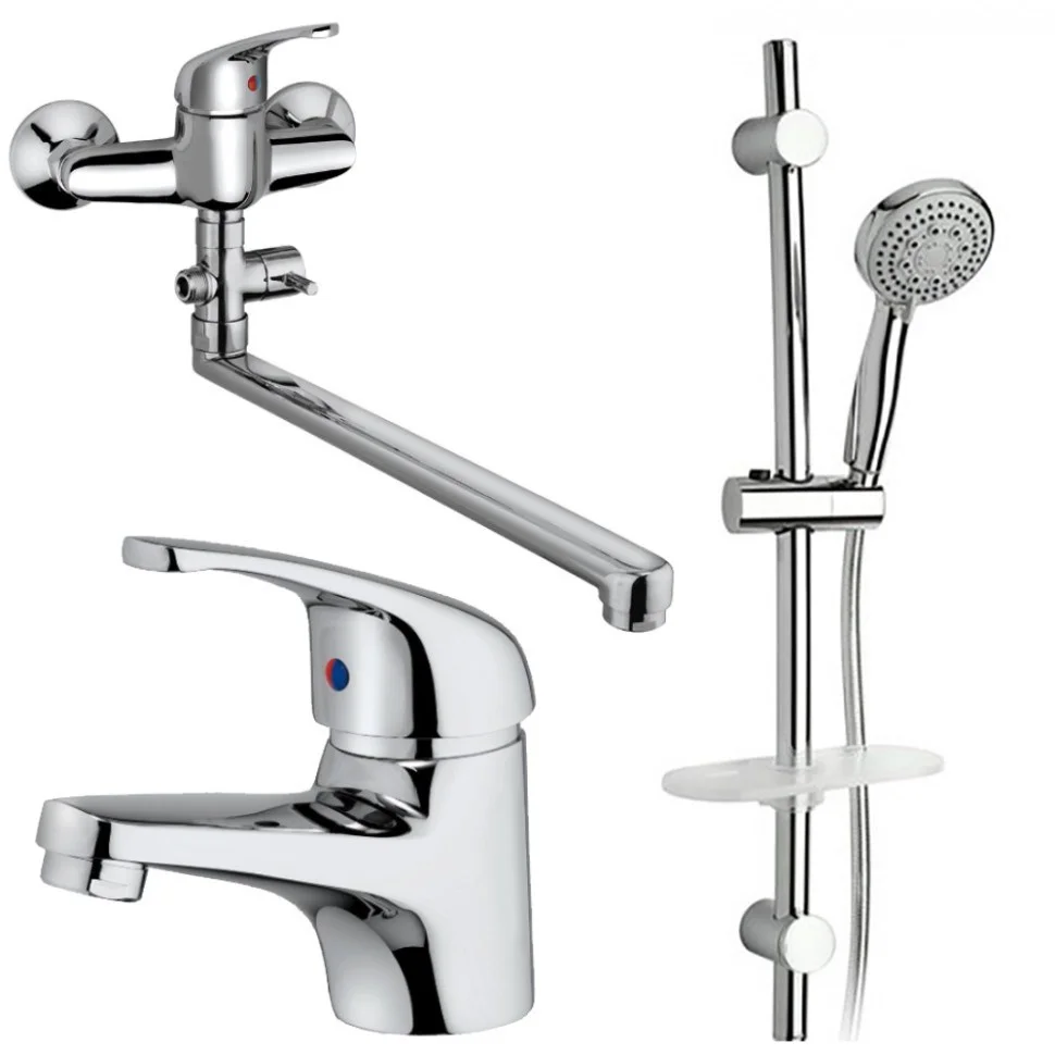 В комплект входит смеситель для раковины (за счет высоты чуть выше средней может отлично размещаться на раковины различных размеров), смеситель для ванны и регулируемый по высоте стальной душевой гарнитур с 5-ти режимной лейкой и полочкой.